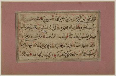 | Keywords: Qur'anic Verses WDL6839.png Artwork ru Стихи Ко ана fr Versets du Coran en Qur'anic Verses zh 古兰经经文 pt Versos do Alcorão ar آيات قرآنية ru Данный каллиг афический ф агмент включает стихи 17 34 из 80-й главы Ко ана под названием ахму ился Абаса <em> Су ат</em> <em>Абаса </em> является анней су ой ниспосланной в екке и состоит из 42 аятов В ней описывается случай когда слепой п е вал П о ока во в емя п оповеди Поскольку этот человек хотел изучать Ко ан П о ок п остил его за то что он п е вал его и отнесся к нему с почтением В стихах возвышенно гово ится об Отк овении и Ко ане Это ведь напоминание / И кто пожелает его вспомнит / В свитках почтенных / Возвышенных очищенных Сотво енных уками писцов / Почтенных благих 80 11 16 Эти стихи написаны свободным письмом насх темно-ко ичневыми че нилами Огласовки также выполнены ко ичневыми че нилами а о фоэпические знаки п оизношение нап име <em>ташдид</em> удвоение согласных и длинные звуки <em>алиф</em> а п оставлены к асными че нилами Знаки обозначения стиха состоят из небольших золотых и к асных к угов или капель аписанные к асными че нилами знаки кото ые указывают на места где можно делать паузу п и п очтении а где нельзя также асполагаются над <em>аятом</em> стихом Панель с каллиг афическим текстом была взята из Ко ана вставлена в цветные амки и наклеена на озовый ка тон для большей п очности <br>А абская каллиг афия; А абские укописи; Иллюмини ование укописей; Исламская каллиг афия; Исламские укописи; Ко ан fr Ce fragment de calligraphie comprend les versets 17-34 du 80<sup>e</sup> chapitre du Coran intitulé <em>Abasa</em> Il s'est renfrogné sourate<em> Abasa</em> est une sourate du début de la période de La Mecque contenant 42 versets Elle décrit un épisode durant lequel un aveugle interrompit le Prophète alors qu'il essayait d'enseigner Le Prophète excusa le dérangement et tint l'homme en grande estime parce qu'il voulait apprendre le Coran Les versets continuent avec une exaltation de révélation et le Coran « Le Coran est un avertissement / Quiconque veut le retiendra dans sa mémoire / Il est écrit sur des pages honorées / Sublimes pures / Tracé par les mains des scribes / Honorés et justes 80 11 16 » Ces versets sont rédigés en une écriture naskh fluide à l'encre marron foncé Les marques de vocalisation sont aussi exécutées à l'encre marron foncé alors que les marques orthoépiques de prononciation - telles que la <em>tashdid</em> duplication de consonne et le <em>alif</em> « a » long - apparaissent à l'encre rouge Les repères de verset sont constitués de petits cercles ou gouttes or et rouge Des notations à l'encre rouge indiquant si l'arrêt de la récitation est permis ou non apparaissent aussi au-dessus des <em>ayats</em> repères de versets Le panneau de calligraphie a été extrait d'un Coran avec des cadres colorés et collé sur un carton rose pour le renforcer <br>Calligraphie arabe; Manuscrits arabes; Enluminures; Calligraphie islamique; Manuscrits islamiques; Coran en This calligraphic fragment includes verses 17 34 of the 80th chapter of the Qur'an entitled '<em>Abasa</em> He frowned <em>Surat</em><em> 'Abasa</em> is an early Meccan surah containing 42 verses It describes an episode during which a blind man interrupted the Prophet while he was attempting to teach Because the man wanted to learn the Qur'an the Prophet excused the disruption and held the man in high honor The verses continue with an exaltation of revelation and the Qur'an It is indeed a Message of instruction / Therefore let whoever will keep it in remembrance / It is in Books held in honor / Exalted kept pure and holy / Written by the hands of scribes / Honorable pious and just 80 11 16 These verses are written in a fluid Naskh script in dark-brown ink Vocalization marks also are executed in brown ink while orthoepics pronunciation marks such as the <em>tashdid </em> duplication of a consonant and long <em>alif</em> a sounds appear in red ink Verse markers consist of small gold and red circles or drops Notations in red ink indicating whether stopping recitation is allowed or not appear above the <em>ayat</em> verse markers as well The panel of calligraphy was extracted from a Qur'an provided with colored frames and pasted onto a pink board for strengthening <br>Arabic calligraphy; Arabic manuscripts; Illuminations; Islamic calligraphy; Islamic manuscripts; Koran zh 此书法残卷中包含 古兰经 第 80 章标题为 <em>Abasa</em>( 皱 )章节的第 17 34 节的经文 <em> 皱</em><em> </em>是包含 42 节经文的早 麦加古兰经 它描述了这样 个情节:先知打算讲授经文时, 个瞎子打断了他 因为这个男子想要学习 古兰经 ,先知原谅了他的唐突,并给予极高的尊重 经文接 对启示和 古兰经 进行颂扬: 这确是 种教训 /谁欲记诵它,就叫谁记诵它吧 /它 珍贵的册业里,/那些册业,是被称扬的,是被涤 的,/