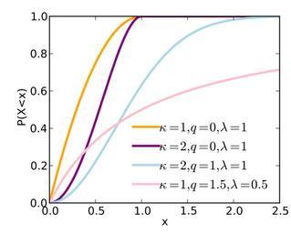 | Keywords: QWeibull cdf.svg en Graph of the q-Weibull cdf 2014-04-21 00 26 51 own <br /> Created with Matplotlib Bscan cc-zero <source lang 'python'> from __future__ import division import numpy as np import matplotlib pyplot as plt def qexp x q if q 1 y np exp x else y 1+ 1-q x 1/ 1-q y 1+ 1-q x < 0 0 return y step 0 001 X np arange 0 2 5 step col 1 'orange' 2 'purple' 3 'lightblue' 4 'pink' plt figure figsize 4 3 2 plt axes 0 17 0 13 0 79 0 8 plt hold True A leg_str lvals 1 1 1 0 5 qvals 0 0 1 1 5 kvals 1 2 2 1 for i q k l in zip range qvals __len__ qvals kvals lvals qp 1/ 2-q lp l/ 2-q 1/k C 1-qexp - X/lp k qp integral sum P step a plt plot X C '-' color coli+1 lw 2 5 A append a leg_str append r \kappa k q q \lambda l format k k q q l l plt xlabel x plt ylabel r P X< x bx plt legend A leg_str numpoints 1 handletextpad 0 loc lower right bx draw_frame False plt savefig qWeibull_cdf svg </source> Uploaded with UploadWizard Q-Weibull distribution |