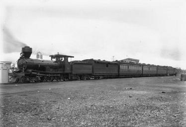 | Keywords: R152, Boorabbin, ca. 1905.jpg A three quarter view of w WAGR R class steam engine no R152 fitted with a soft coal chimney with an Eastern Goldfields Railway passenger train at Boorabbin Western Australia Boorabbin Western Australia http //innopac slwa wa gov au/record b2529436 State Library of Western Australia call number 006154PD 1905 Passey Collection Of Photographs PD-Australia 1905 in rail transport in Australia WAGR R class | ||||