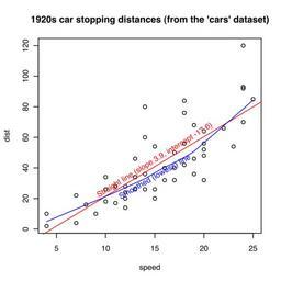 | Keywords: R-basic cars plot example.svg en A simple graph to illustrate basic plotting routines in R plot abline lines text title own HYanWong 2009-01-13 Created with R using the following commands <pre> svg R-basic_cars_plot_example svg 4 4 8 plot cars abline -17 6 3 9 col red abline adds a straight line to the plot lines lowess cars col blue lines adds a sequence of joined-up lines text 15 34 Smoothed lowess line srt 30 col blue text adds text text 15 45 Straight line slope 3 9 intercept -17 6 srt 32 col red srt rotates title 1920s car stopping distances from the 'cars' dataset dev off </pre> Uncategorized 2015 March 23 |
