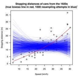| Keywords: R-car stopping distances 1920+bootstrap1000.svg en Created with R <pre>svg R-car_stopping_distances_1920+bootstrap1000 svg 4 4 8 speed kph <- cars speed 1 609344 dist m <- cars dist 0 3048 plot speed kph dist m xlab Speed km/h ylab Stopping distance m las 1 main Stopping distances of cars from the 1920s true lowess line in red 1000 resampling attempts in blue ` replicate 1000 lines lowess sample speed kph replace TRUE sample dist m replace T f 2/3 iter 3 col rgb 0 0 1 0 1 -> dummy lines lowess speed kph dist m f 2/3 iter 3 col red dev off </pre> Own HYanWong 2008-11-14 Subfields of statistics Created with R |