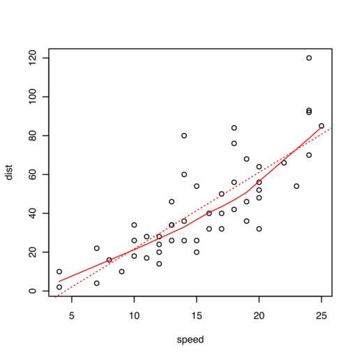 | Keywords: R-car stopping distances 1920-plain.svg en Example used in the wikibook Statistical_Analysis _an_Introduction_using_R generated by <pre>> svg R-car_stopping_distances_1920-plain svg 4 4 8 > plot dist ~ speed data cars It is easy to do a simple plot > smooth line <- lowess cars speed cars dist The lowess function fits a LOcally WEighted Scatterplot Smoother > lines smooth line col red lines adds lines to a plot here the lowess smooth-line fit > straight line model <- lm dist~speed data cars This creates and stores a model lm means Linear Model > abline straight line model col red lty 3 abline is a simple function that plots a straight line > dev off </pre> Created with R Own HYanWong 2008-11-30 Uncategorized 2015 March 23 |
