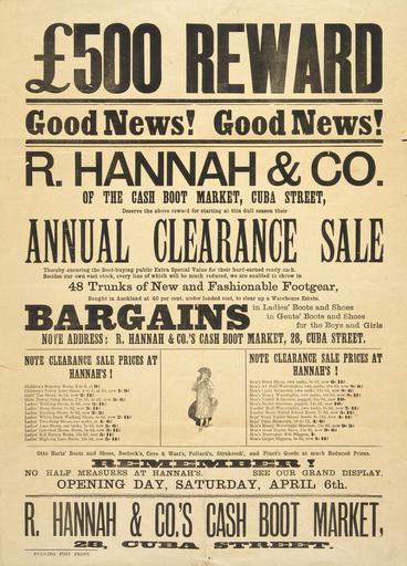 | Keywords: text outdoor Arrangement of text with one small inset of young woman in Victorian frills. Lists all special bargains available. Gives address of shop at 28 Cuba Street. Inscriptions: Inscribed - Recto - bottom left: Evening post print.. Dated with reference to perpetual calendar. Quantity: 1 b&w photo-mechanical print(s). Physical Description: Letterpress 555 x 398 mm. Provenance: Donated by Dr Les Cleveland in 1996. Cleveland, Francis Leslie, 1921-2014. R. Hannah & Co. :500 pounds reward. R Hannah & Co, of the cash boot market, Cuba Street, deserve the above reward for starting at this dull season their Annual Clearance sale. Opening Day Saturday April 6th [1895 or 1901].. Ref: Eph-D-COSTUME-1895-01. Alexander Turnbull Library, Wellington, New Zealand. natlib.govt.nz/records/23037270 Arrangement of text with one small inset of young woman in Victorian frills. Lists all special bargains available. Gives address of shop at 28 Cuba Street. Inscriptions: Inscribed - Recto - bottom left: Evening post print.. Dated with reference to perpetual calendar. Quantity: 1 b&w photo-mechanical print(s). Physical Description: Letterpress 555 x 398 mm. Provenance: Donated by Dr Les Cleveland in 1996. Cleveland, Francis Leslie, 1921-2014. R. Hannah & Co. :500 pounds reward. R Hannah & Co, of the cash boot market, Cuba Street, deserve the above reward for starting at this dull season their Annual Clearance sale. Opening Day Saturday April 6th [1895 or 1901].. Ref: Eph-D-COSTUME-1895-01. Alexander Turnbull Library, Wellington, New Zealand. natlib.govt.nz/records/23037270 |