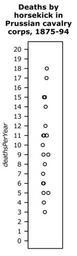 | Keywords: R-horsekick totals-1D jitter.svg en 1D vertical scatterplot aka vertical dot plot or strip plot example with discrete data points jittered Data von Bortkiewicz's famous dataset of deaths by horse kick in Prussian cavalry corps own HYanWong 2009-03-06 Created with R using the following commands <pre> svg file R-horsekick_totals-1D_jitter svg width 1 5 height 5 pointsize 8 1D vertical scatterplot aka vertical dot plot or strip plot example with discrete data points jittered Data von Bortkiewicz's famous dataset of deaths by horse kick in Prussian cavalry corps library pscl par mar c 1 4 6 2 +0 1 stripchart tapply prussian y prussian year sum pch 1 ylab expression italic deathsPerYear method jitter vertical TRUE las 1 yaxp c 0 20 20 ylim c 0 20 title Deaths by\nhorsekick in\nPrussian cavalry\ncorps 1875-94 outer TRUE line -5 dev off </pre> Uncategorized 2015 March 23 |