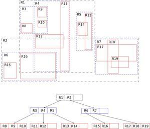 Keywords: R-tree.svg П име R-де ева Beispiel für einen R-Baum R-tree example Przykład R-drzewa Ejemplo de Árbol-R own Skinkie w en Radim Baca 2010-04-06 public domain R-tree