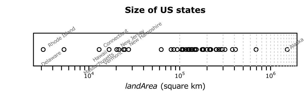 Keywords: R-US state areas-1D log+extras.svg en 1D horizontal scatter plot aka dot plot or strip plot example with continuous data logged axis and outliers identified by name Data US state areas Own HYanWong 2009-03-06 Created with R using the following commands <pre> svg file R-US_state_areas-1D_log+extras svg width 5 height 1 5 pointsize 8 1D horizontal scatter plot aka dot plot or strip plot example with continuous data logged axis and outliers identified by name Data US state areas par mar c 3 4 4 1 +0 1 X <- log10 state area 2 58998811 stripchart X pch 1 xaxt n xlab expression paste italic landArea square km mgp c 2 0 5 0 axis 1 log10 1 9 rep 10 3 7 each 9 rep 45 axis 1 log10 10 3 6 expression 10 3 10 4 10 5 10 6 cex axis 0 8 mgp c 2 0 5 0 abline v log10 seq 0 2e6 100000 lty dotted col lightgray title main Size of US states line 2 5 Add outliers outliers <- order match X sort boxplot stats X out na last NA odd <- c TRUE FALSE text Xoutliersodd 1 labels state nameoutliersodd adj -0 2 cex 0 65 srt 35 xpd NA col grey40 text Xoutliers odd 1 labels state nameoutliers odd adj 1 2 cex 0 65 srt 35 xpd NA col grey40 dev off </pre> Dot plots |
