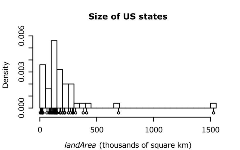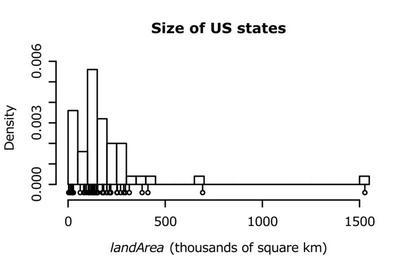 | Keywords: R-US state areas-histogram hires+points.svg en Histogram example with continuous data high resolution narrow bins with actual points marked on x-axis Data US state areas Own HYanWong 2009-03-06 Created with R using the following commands <pre> svg file R-US_state_areas-histogram_hires+points svg width 4 height 2 5 pointsize 8 Histogram example with continuous data high resolution narrow bins with actual points marked on x-axis Data US state areas par mar c 4 4 4 2 +0 1 X <- state area 2 58998811/1000 hist X breaks 25 xlab expression paste italic landArea thousands of square km main Size of US states ylim c -0 0005 0 006 las 0 freq FALSE points X rep -0 0004 length X cex 0 5 segments X -0 0003 X 0 dev off </pre> Histograms |