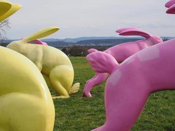 Keywords: rabbit bunny butt butt artwork yellow pink seat and flitz rabbits rosalie madaris ostfildern esslingen scharnhauser park giant rabbits colorful art modern art art object rabbit couples object art