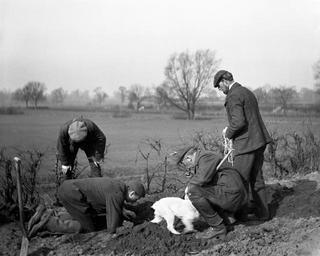 | Keywords: Rabbit ferreting YORYM-S154.jpg A group of four men in tweeds and caps around a rabbit hole; one is kneeling on the ground investigating the hole a second to the right is down on one knee with a small light-coloured dog and the other two stand The man to the right has a long length of thin rope and there is a spade to the left of the picture The men are on rough ground with a small spindly hedge behind them In the background is a field with trees depicted people depicted place 1900-1912 glass plate negative 125mm long edge x 100mm short edge institution Yorkshire Museum object history exhibition history credit line accession number YORYM S154 York Museums Trust image PD-old-70-1923 PD-US Images from The Sydney Harold Smith Collection Uploaded with UploadWizard |