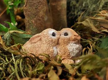 Keywords: rabbits bunny bunnies toy figurine statue woods forest setting animals two pair