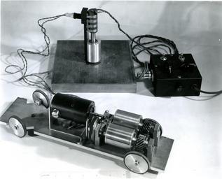 | Keywords: RabinowJacob 005.jpg The important elements of this system are the clutches housed in the twin steel cylinders on the chassis of the model the control box at the top right and the pivitol connector between the control box and the motor and clutches of the model top center The motor shaft on the model drives a friction disc connected to a small magnetic fluid cltch geared to the rear wheels One end of the second clutch housed in the cylinder nearest the rear right wheel is locked to the frame so that it can be used as a brake Jacob Rabinow invented the Magnetic Particle Clutch in 1947 during his work on ordnance at the National Bureau of Standards The particle clutch used a mixture of light lubricating oil and powdered carbonyl iron inside a chamber connecting two free spinning plates When an electromagnet attached to the chamber was energized the iron particles would magnetize and attract each other producing an almost solid mass which locked the plates together Controlling the magnetic flux would control the amount of torque between the plates Because Rabinow invented the Magnetic Particle Clutch as part of his work at the National Bureau of Standards the United States Government owned the U S patent However in partnership with his brother Joseph Rabinow did file for patents in 22 foreign countries Due of the simple design precise torque control smooth operation and long life the device found wide application It was used in Renault and Subaru automobiles in Europe and Japan in airplane controls and in the disc file of the IBM RAMAC computer Reference Inventing for Fun and Profit Jacob Rabinow San Francisco Press San Francisco CA 1990 pp 49-55 National Institute of Standards and Technology National Institute of Standards and Technology PD-USGov-NIST PD-USGov Magnetic_particle_clutches |