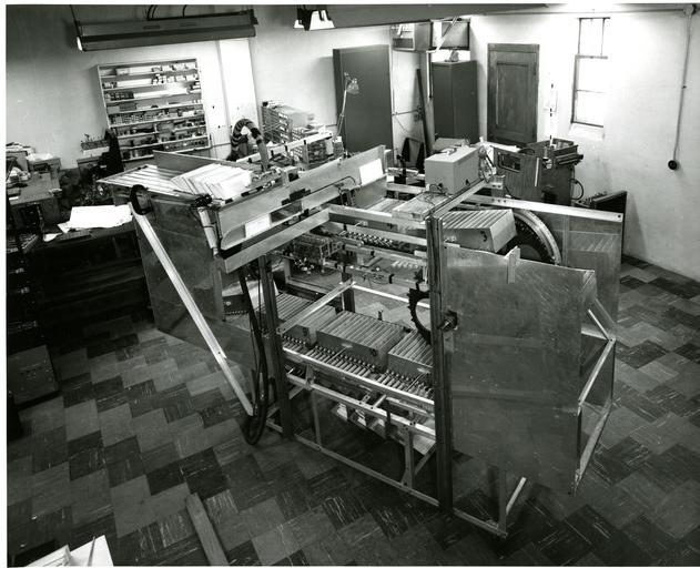 Keywords: RabinowJacob 022.jpg In 1957 Jacob Rabinowâ ‚¬ „˘s company Rabinow Engineering designed a mechanical coding and sorting system for the U S Post Office Based on similar work Rabinow had done previously for the Census Bureau the system for the Post Office consisted of a conveyor belt cart designed to carry 12 envelopes in separate compartments Each compartment in the cart was accompanied by an escort memory The escort memory consisted of a shaft carrying a series of nylon code wheels Each of the 134 wheels could move laterally into one of two positions With this combination more than 8000 in decimal notation binary numbers could be set Twelve keyboard operators would read envelope addresses and set the positions of the code wheels The wheels were supported on a track also composed of binary elements When the encoded compartment hit the same encoded position on the track the shaft dropped triggering a door release in the compartment holding the envelope The envelope then fell into the appropriate pocket About 600 of the letter sorting machines were built and used by the Post Office In later operations optical character recognition technology replaced the keyboard operators and the mechanical escort memory was replaced by computer memory Reference Inventing for Fun and Profit Jacob Rabinow San Francisco Press San Francisco CA 1990 pp 100-138 National Institute of Standards and Technology National Institute of Standards and Technology PD-USGov-NIST PD-USGov Postal equipment