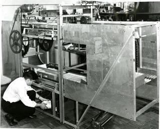 | Keywords: RabinowJacob 042.jpg Overall view of the laboratory prototype machine developed for the Post Office for the automatic high-speed sorting of letter mail It can sort at the rate of 36 ooo letters per hour into as many categories as may be needed It consists essentially of a large number of pockets on an endless conveyor and electromechanical equipment that controls the dropping of a letter from a pocket into a specific fixed receptacle As can be seen in the photographs fourteen pockets are grouped together into a single unit for convenience of handling on the conveyor In 1957 Jacob Rabinowâ ‚¬ „˘s company Rabinow Engineering designed a mechanical coding and sorting system for the U S Post Office Based on similar work Rabinow had done previously for the Census Bureau the system for the Post Office consisted of a conveyor belt cart designed to carry 12 envelopes in separate compartments Each compartment in the cart was accompanied by an escort memory The escort memory consisted of a shaft carrying a series of nylon code wheels Each of the 134 wheels could move laterally into one of two positions With this combination more than 8000 in decimal notation binary numbers could be set Twelve keyboard operators would read envelope addresses and set the positions of the code wheels The wheels were supported on a track also composed of binary elements When the encoded compartment hit the same encoded position on the track the shaft dropped triggering a door release in the compartment holding the envelope The envelope then fell into the appropriate pocket About 600 of the letter sorting machines were built and used by the Post Office In later operations optical character recognition technology replaced the keyboard operators and the mechanical escort memory was replaced by computer memory Reference Inventing for Fun and Profit Jacob Rabinow San Francisco Press San Francisco CA 1990 pp 100-138 National Institute of Standards and Technology 4/1/1958 National Institute of Standards and Technology PD-USGov-NIST PD-USGov Postal equipment |