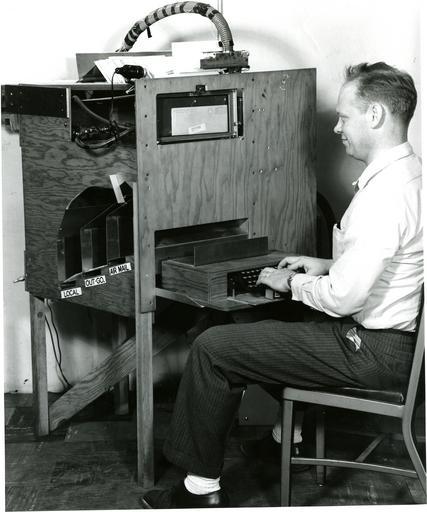 | Keywords: RabinowJacob 047.jpg In 1957 Jacob Rabinowâ ‚¬ „˘s company Rabinow Engineering designed a mechanical coding and sorting system for the U S Post Office Based on similar work Rabinow had done previously for the Census Bureau the system for the Post Office consisted of a conveyor belt cart designed to carry 12 envelopes in separate compartments Each compartment in the cart was accompanied by an escort memory The escort memory consisted of a shaft carrying a series of nylon code wheels Each of the 134 wheels could move laterally into one of two positions With this combination more than 8000 in decimal notation binary numbers could be set Twelve keyboard operators would read envelope addresses and set the positions of the code wheels The wheels were supported on a track also composed of binary elements When the encoded compartment hit the same encoded position on the track the shaft dropped triggering a door release in the compartment holding the envelope The envelope then fell into the appropriate pocket About 600 of the letter sorting machines were built and used by the Post Office In later operations optical character recognition technology replaced the keyboard operators and the mechanical escort memory was replaced by computer memory Reference Inventing for Fun and Profit Jacob Rabinow San Francisco Press San Francisco CA 1990 pp 100-138 National Institute of Standards and Technology 4/1/1958 National Institute of Standards and Technology PD-USGov-NIST PD-USGov Postal equipment |