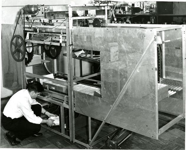 Keywords: RabinowJacob 056.jpg Overall view of the laboratory prototype machine developed for the Post Office for the automatic high-speed sorting of letter mail It can sort at the rate of 36 ooo letters per hour into as many categories as may be needed It consists essentially of a large number of pockets on an endless conveyor and electromechanical equipment that controls the dropping of a letter from a pocket into a specific fixed receptacle As can be seen in the photographs fourteen pockets are grouped together into a single unit for convenience of handling on the conveyor In 1957 Jacob Rabinowâ ‚¬ „˘s company Rabinow Engineering designed a mechanical coding and sorting system for the U S Post Office Based on similar work Rabinow had done previously for the Census Bureau the system for the Post Office consisted of a conveyor belt cart designed to carry 12 envelopes in separate compartments Each compartment in the cart was accompanied by an escort memory The escort memory consisted of a shaft carrying a series of nylon code wheels Each of the 134 wheels could move laterally into one of two positions With this combination more than 8000 in decimal notation binary numbers could be set Twelve keyboard operators would read envelope addresses and set the positions of the code wheels The wheels were supported on a track also composed of binary elements When the encoded compartment hit the same encoded position on the track the shaft dropped triggering a door release in the compartment holding the envelope The envelope then fell into the appropriate pocket About 600 of the letter sorting machines were built and used by the Post Office In later operations optical character recognition technology replaced the keyboard operators and the mechanical escort memory was replaced by computer memory Reference Inventing for Fun and Profit Jacob Rabinow San Francisco Press San Francisco CA 1990 pp 100-138 National Institute of Standards and Technology 4/1/1958 National Institute of Standards and Technology PD-USGov-NIST PD-USGov Postal equipment |