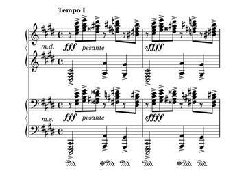 | Keywords: Rachmaninow Prelude Cis Moll Lilypond.svg The pdf-version can be found here http //upload wikimedia org/wikipedia/commons/1/18/RachmaninowLilypond pdf RachmaninowLilypond en Rachmaninoff's Prelude in C-sharp minor Op 3 No 2; the recapitulation of the theme in four staves Engraved by Lilypond 2013-07-10 20 47 56 Lilypond The Ski The music featured is Rachmaninoff's whose copyright has expired This version is released to public domain by the version creator RachmaninowLilypond pdf Prelude_3_2_Rach png Prelude 3 2 Rach Amadeus png Prelude 3 2 Rach Capella png Prelude 3 2 Rach PriMus png Lilypond-Datei <pre> \version 2 14 2 \language deutsch \header title Cis-Moll-Prélude subtitle op 3 no 2 composer Sergei Rachmaninow tagline removed \paper paper-height 11 0\cm paper-width 14 8\cm indent 5 \layout \context \Score \remove Bar_number_engraver global \key cis \minor \override Staff TimeSignature 'transparent t \time 4/4 \tempo Tempo I \set Staff extraNatural f sffff make-dynamic-script markup line dynamic sffff rightPianoI \relative c' \global r8 \fff<cis' e gis cis>-> <e gis h e>-> <dis fisis ais dis>-> r <d fis his d>-> r <his dis fis his>-> 1 r <cis e gis cis>-> \sffff <e gis h e>-> <dis fisis ais dis>-> r <d fis his d>-> r <his dis fis his>-> leftPianoI \relative c' \global <cis e gis cis>2-> \markup \halign 3 1 \italic m d <a' a'>4-> \markup \null \right-align \raise 1 5 \italic pesante <gis gis'>-> 1 <cis e gis cis>2-> <a' a'>4-> <gis gis'>-> rightPianoII \relative c \global r8 \fff <e gis cis e>-> <gis h e gis>-> <fisis ais dis fisis>-> r <fis his d fis>-> r <dis fis his dis>-> 1 r <e gis cis e>-> \sffff <gis h e gis>-> <fisis ais dis fisis>-> r <fis his d fis>-> r <dis fis his dis>-> leftPianoII \relative c \global <cis e gis cis>2-> \markup \halign 3 4 \italic m s <a' a'>4-> \markup \null \right-align \raise 1 5 \italic pesante <gis gis'>-> 1 <cis e gis cis>2-> <a' a'>4-> <gis gis'>-> pedal \global \override SustainPedal 'X-offset -1 s2\sustainOn s4\sustainOff \sustainOn s \sustainOn s2\sustainOn s4\sustainOff \sustainOn s \sustainOn pianoIPart \new PianoStaff \with instrumentName Klav I << \new Staff right \with midiInstrument acoustic grand \rightPianoI \new Staff left \with midiInstrument acoustic grand \leftPianoI >> pianoIIPart \new PianoStaff \with instrumentName Klav II << \new Staff right \with midiInstrument acoustic grand \clef bass \rightPianoII \new Staff left \with midiInstrument acoustic grand \clef bass \leftPianoII \new Dynamics pedal \with \pedal >> \score << \pianoIPart \pianoIIPart >> \layout \midi \context \Score tempoWholesPerMinute ly make-moment 72 4 </pre> Sheet music of Sergei Rachmaninoff Prelude in C sharp minor Rachmaninoff |