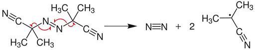 Keywords: Radical initiator AIBN.svg en Formation of Radicals from AIBN de Bildung der Radikale aus AIBN own Joh bol 2012-06-06 Cc-zero AIBN Radical reactions