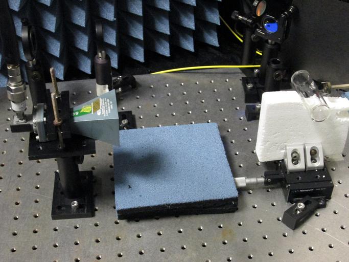 | Keywords: Radio Frequency (RF) Laboratory Apparatus (14531317469).jpg Laboratory apparatus for mapping and imaging of radio frequency RF electric fields at resolutions below the usual RF wavelength limit Rubidium atoms are placed in the glass cylinder on the right which is illuminated at opposite ends by red and blue laser beams The cylinder 2 5 by 7 5 centimeters in size moves left on a track to enable the narrow laser beams to scan its entire width The antenna on the left generates an RF field which depending on its frequency has a certain effect on the spectrum of light absorbed by the atoms By measuring this effect researchers can calculate and map the RF field strength as a function of position in the cylinder See also http //www nist gov/pml/electromagnetics/subwave-061714 cfm www nist gov/pml/electromagnetics/subwave-061714 cfm Credit Holloway/NIST Disclaimer Any mention of commercial products within NIST web pages is for information only; it does not imply recommendation or endorsement by NIST Use of NIST Information These World Wide Web pages are provided as a public service by the National Institute of Standards and Technology NIST With the exception of material marked as copyrighted information presented on these pages is considered public information and may be distributed or copied Use of appropriate byline/photo/image credits is requested https //www flickr com/photos/usnistgov/14531317469/ Radio Frequency RF Laboratory Apparatus 2014-01-22 11 21 https //www flickr com/people/63059536 N06 National Institute of Standards and Technology PD-USGov National Institute of Standards and Technology https //flickr com/photos/63059536 N06/14531317469 2016-09-07 01 31 48 United States Government Work Uncategorized 2016 November 8 |