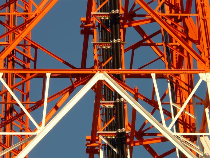 Keywords: radio tower radio mast greened transmission tower metal strut iron architecture evening light red