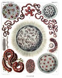| Keywords: Radiolaria (Challenger) Plate 003.jpg follows <table> <tr> <td style text-align center; vertical-align top; colspan 3 >Plate 3 Collozoida </td> </tr> <tr> <td style font-size 85 ; text-align right; vertical-align top; colspan 3 >Diam </td> </tr> <tr> <td style vertical-align top; >Fig 1 Collozoum serpentinum n sp vel Collophidium serpentinum Hkl </td> <td style vertical-align bottom; >×</td> <td style text-align right; vertical-align bottom; >10</td> </tr> <tr> <td style font-size 85 ; padding-left 3em; text-indent -1em; vertical-align top; >A living cœnobium with expanded pseudopodia The spherical calymma or the common jelly-mass of the colony is alveolate and contains numerous cylindrical serpentine central capsules Numerous yellow cells or xanthellæ are scattered between the radial pseudopodia in the periphery </td> </tr> <tr> <td style vertical-align top; >Fig 2 Collozoum serpentinum n sp </td> <td style vertical-align bottom; >×</td> <td style text-align right; vertical-align bottom; >50</td> </tr> <tr> <td style font-size 85 ; padding-left 3em; text-indent -1em; vertical-align top; >An isolated cylindrical worm-shaped central capsule with an axial series of oil-globules; the red points are nuclei </td> </tr> <tr> <td style vertical-align top; >Fig 3 Collozoum serpentinum n sp </td> <td style vertical-align bottom; >×</td> <td style text-align right; vertical-align bottom; >150</td> </tr> <tr> <td style font-size 85 ; padding-left 3em; text-indent -1em; vertical-align top; >An isolated cylindrical serpentine central capsule k Oil-globules forming an axial series; n densely placed red-coloured nuclei; c the capsule membrane under which are scattered small black pigment spots in the colourless cortical zone of the endoplasm; a extracapsular alveoles; x xanthellæ or yellow cells </td> </tr> <tr> <td style vertical-align top; >Fig 4 Collozoum amœboides n sp </td> <td style vertical-align bottom; >×</td> <td style text-align right; vertical-align bottom; >100</td> </tr> <tr> <td style font-size 85 ; padding-left 3em; text-indent -1em; vertical-align top; >A spherical cœnobium or jelly-colony Each amœboid central capsule contains an oil-globule; the small red points are nuclei </td> </tr> <tr> <td style vertical-align top; >Fig 5 Collozoum amœboides n sp </td> <td style vertical-align bottom; >×</td> <td style text-align right; vertical-align bottom; >400</td> </tr> <tr> <td style font-size 85 ; padding-left 3em; text-indent -1em; vertical-align top; >c A single isolated central capsule; n nuclei; k oil-globule </td> </tr> <tr> <td style vertical-align top; >Fig 6 Collozoum vermiforme n sp </td> <td style vertical-align bottom; >×</td> <td style text-align right; vertical-align bottom; >30</td> </tr> <tr> <td style font-size 85 ; padding-left 3em; text-indent -1em; vertical-align top; >g A spherical cœnobium or jelly-colony; a large alveoles forming a cortical zone; c central capsules; k oil-globules </td> </tr> <tr> <td style vertical-align top; >Fig 7 Collozoum vermiforme n sp </td> <td style vertical-align bottom; >×</td> <td style text-align right; vertical-align bottom; >100</td> </tr> <tr> <td style font-size 85 ; padding-left 3em; text-indent -1em; vertical-align top; >c A single isolated central capsule; x xanthellæ surrounding this central capsule; k oil-globules; n nuclei </td> </tr> <tr> <td style vertical-align top; >Fig 8 Collozoum ellipsoides n sp </td> <td style vertical-align bottom; >×</td> <td style text-align right; vertical-align bottom; >2</td> </tr> <tr> <td style font-size 85 ; padding-left 3em; text-indent -1em; vertical-align top; >A spherical colony; the red points are central capsules </td> </tr> <tr> <td style vertical-align top; >Fig 9 Collozoum ellipsoides n sp </td> <td style vertical-align bottom; >×</td> <td style text-align right; vertical-align bottom; >150</td> </tr> <tr> <td style font-size 85 ; padding-left 3em; text-indent -1em; vertical-align top; >c A single isolated central capsule; k oil-globules; n nuclei </td> </tr> <tr> <td style vertical-align top; >Fig 10 Collozoum inerme Hkl </td> <td style vertical-align bottom; >×</td> <td style text-align right; vertical-align bottom; >2</td> </tr> <tr> <td style font-size 85 ; padding-left 3em; text-indent -1em; vertical-align top; >An old cylindrical articulated cœnobium; the red points are centralcapsules </td> </tr> <tr> <td style vertical-align top; >Fig 11 Collozoum inerme Hkl </td> <td style vertical-align bottom; >×</td> <td style text-align right; vertical-align bottom; >2</td> </tr> <tr> <td style font-size 85 ; padding-left 3em; text-indent -1em; vertical-align top; >A young cylindrical cœnobium; the red points are central capsules </td> </tr> <tr> <td style vertical-align top; >Fig 12 Collozoum inerme Hkl </td> <td style vertical-align bottom; >×</td> <td style text-align right; vertical-align bottom; >400</td> </tr> <tr> <td style font-size 85 ; padding-left 3em; text-indent -1em; vertical-align top; >A piece of a young colony with eight small central capsules without oil-globules n The central nucleus in different stages of division Two capsules are also dividing x Xanthellæ in the jelly-like calymma blue which also contains numerous vacuoles </td> </tr> </table> https //archive org/details/reportonradiolar00haecrich 1887 Ernst Haeckel 1834-1919 ; engravings by Adolf Giltsch 1852-1911 PD-old-auto-1923 1919 Report on the Radiolaria |