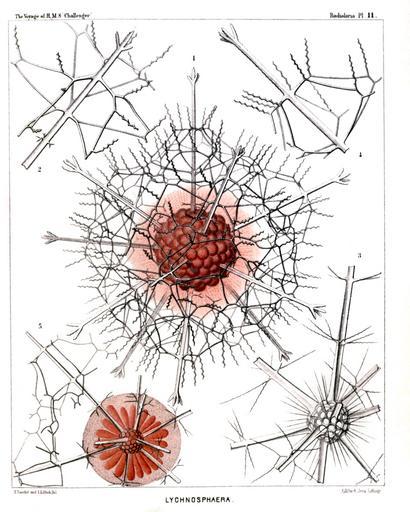 Keywords: Radiolaria (Challenger) Plate 011.jpg follows <table> <tr> <td style text-align center; vertical-align top; colspan 3 >Plate 11 Astrosphærida </td> </tr> <tr> <td style font-size 85 ; text-align right; vertical-align top; colspan 3 >Diam </td> </tr> <tr> <td style vertical-align top; >Fig 1 Lychnosphæra regina n sp </td> <td style vertical-align bottom; >×</td> <td style text-align right; vertical-align bottom; >200</td> </tr> <tr> <td style font-size 85 ; padding-left 3em; text-indent -1em; vertical-align top; >The entire shell and the central capsule Numerous club-shaped radial apophyses or cœcal sacs arise from the pink central capsule and are protruded through the pores of the medullary shell which is completely hidden by them The sarcomatrix in the calymma surrounding the central capsule exhibits a fine radial striation Numerous retracted pseudopodia bearing red granules arise from the sarcomatrix and pierce the calymma radially The interval between the two concentric shells is filled up by the hyaline calymma </td> </tr> <tr> <td style vertical-align top; >Fig 2 Lychnosphæra regina n sp </td> <td style vertical-align bottom; >×</td> <td style text-align right; vertical-align bottom; >400</td> </tr> <tr> <td style font-size 85 ; padding-left 3em; text-indent -1em; vertical-align top; >A part of the cortical shell with a radial spine </td> </tr> <tr> <td style vertical-align top; >Fig 3 Lychnosphæra regina n sp </td> <td style vertical-align bottom; >×</td> <td style text-align right; vertical-align bottom; >400</td> </tr> <tr> <td style font-size 85 ; padding-left 3em; text-indent -1em; vertical-align top; >The medullary shell and the basal parts of the radial spines arising from it </td> </tr> <tr> <td style vertical-align top; >Fig 4 Lychnosphæra regina n sp </td> <td style vertical-align bottom; >×</td> <td style text-align right; vertical-align bottom; >400</td> </tr> <tr> <td style font-size 85 ; padding-left 3em; text-indent -1em; vertical-align top; >Distal end of a radial spine </td> </tr> <tr> <td style vertical-align top; >Fig 5 Rhizoplegma lychnosphæra n sp </td> <td style vertical-align bottom; >×</td> <td style text-align right; vertical-align bottom; >200</td> </tr> <tr> <td style font-size 85 ; padding-left 3em; text-indent -1em; vertical-align top; >The central capsule and the enclosed parts of the skeleton The protoplasm is radially striped The central nucleus red sends out numerous radial apophyses which are protruded through the pores of the medullary shell </td> </tr> </table> https //archive org/details/reportonradiolar00haecrich 1887 Ernst Haeckel 1834-1919 ; engravings by Adolf Giltsch 1852-1911 PD-old-auto-1923 1919 Report on the Radiolaria |