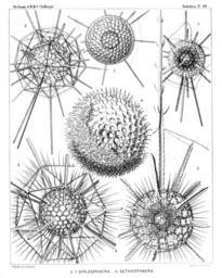 | Keywords: Radiolaria (Challenger) Plate 019.jpg follows <table> <tr> <td style text-align center; vertical-align top; colspan 3 >Plate 19 Astrosphærida </td> </tr> <tr> <td style font-size 85 ; text-align right; vertical-align top; colspan 3 >Diam </td> </tr> <tr> <td style vertical-align top; >Fig 1 Drymosphæra polygonalis n sp </td> <td style vertical-align bottom; >×</td> <td style text-align right; vertical-align bottom; >200</td> </tr> <tr> <td style vertical-align top; >Fig 2 Leptosphæra hexagonalis n sp </td> <td style vertical-align bottom; >×</td> <td style text-align right; vertical-align bottom; >200</td> </tr> <tr> <td style font-size 85 ; padding-left 3em; text-indent -1em; vertical-align top; >Showing the central capsule forming numerous club-shaped protuberances and the simple spherical nucleus in its centre The skeleton is nearly the same as in Diplosphæra hexagonalis fig 3 </td> </tr> <tr> <td style vertical-align top; >Fig 3 Diplosphæra hexagonalis n sp </td> <td style vertical-align bottom; >×</td> <td style text-align right; vertical-align bottom; >200</td> </tr> <tr> <td style font-size 85 ; padding-left 3em; text-indent -1em; vertical-align top; >The spherical central capsule with radially striped protoplasm is enclosed in the inner shell and exhibits in its centre the clear spherical nucleus </td> </tr> <tr> <td style vertical-align top; >Fig 4 Astrosphæra hexagonalis n sp </td> <td style vertical-align bottom; >×</td> <td style text-align right; vertical-align bottom; >300</td> </tr> <tr> <td style vertical-align top; >Fig 5 Astrosphæra stellata n sp </td> <td style vertical-align bottom; >×</td> <td style text-align right; vertical-align bottom; >300</td> </tr> <tr> <td style font-size 85 ; padding-left 3em; text-indent -1em; vertical-align top; >The central capsule enclosed in the inner shell exhibits a distinct radial striation of the protoplasm and in the centre a clear spherical nucleus </td> </tr> <tr> <td style vertical-align top; >Fig 6 Haliomma rhodococcus n sp vel Sethosphæra rhodococcus </td> <td style vertical-align bottom; >×</td> <td style text-align right; vertical-align bottom; >400</td> </tr> <tr> <td style font-size 85 ; padding-left 3em; text-indent -1em; vertical-align top; >The greater part of the outer shell is removed </td> </tr> </table> https //archive org/details/reportonradiolar00haecrich 1887 Ernst Haeckel 1834-1919 ; engravings by Adolf Giltsch 1852-1911 PD-old-auto-1923 1919 Report on the Radiolaria |