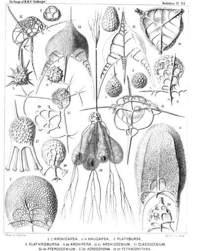 Keywords: Radiolaria (Challenger) Plate 053.jpg follows <table> <tr> <td style text-align center; vertical-align top; colspan 3 >Plate 53 Zygospyrida Tripocalpida Phænocalpida et Cyrtocalpida </td> </tr> <tr> <td style font-size 85 ; text-align right; vertical-align top; colspan 3 >Diam </td> </tr> <tr> <td style vertical-align top; >Fig 1 Archicapsa triforis n sp </td> <td style vertical-align bottom; >×</td> <td style text-align right; vertical-align bottom; >300</td> </tr> <tr> <td style font-size 85 ; padding-left 3em; text-indent -1em; vertical-align top; >Lateral view </td> </tr> <tr> <td style vertical-align top; >Fig 2 Archicapsa triforis n sp </td> <td style vertical-align bottom; >×</td> <td style text-align right; vertical-align bottom; >300</td> </tr> <tr> <td style font-size 85 ; padding-left 3em; text-indent -1em; vertical-align top; >Basal view </td> </tr> <tr> <td style vertical-align top; >Fig 3 Halicapsa triglochin n sp </td> <td style vertical-align bottom; >×</td> <td style text-align right; vertical-align bottom; >200</td> </tr> <tr> <td style font-size 85 ; padding-left 3em; text-indent -1em; vertical-align top; >Lateral view </td> </tr> <tr> <td style vertical-align top; >Fig 4 Halicapsa triglochin n sp </td> <td style vertical-align bottom; >×</td> <td style text-align right; vertical-align bottom; >200</td> </tr> <tr> <td style font-size 85 ; padding-left 3em; text-indent -1em; vertical-align top; >Basal view </td> </tr> <tr> <td style vertical-align top; >Fig 5 Halicapsa hystrix n sp </td> <td style vertical-align bottom; >×</td> <td style text-align right; vertical-align bottom; >200</td> </tr> <tr> <td style font-size 85 ; padding-left 3em; text-indent -1em; vertical-align top; >Lateral view </td> </tr> <tr> <td style vertical-align top; >Fig 6 Halicapsa hystrix n sp </td> <td style vertical-align bottom; >×</td> <td style text-align right; vertical-align bottom; >200</td> </tr> <tr> <td style font-size 85 ; padding-left 3em; text-indent -1em; vertical-align top; >Basal view </td> </tr> <tr> <td style vertical-align top; >Fig 7 Cantharospyris platybursa n sp vel Platybursa compressa </td> <td style vertical-align bottom; >×</td> <td style text-align right; vertical-align bottom; >400</td> </tr> <tr> <td style vertical-align top; >Fig 8 Tessarospyris clathrobursa n sp vel Clathrobursa dictyopus </td> <td style vertical-align bottom; >×</td> <td style text-align right; vertical-align bottom; >400</td> </tr> <tr> <td style vertical-align top; >Fig 9 Peridium spinipes n sp </td> <td style vertical-align bottom; >×</td> <td style text-align right; vertical-align bottom; >500</td> </tr> <tr> <td style vertical-align top; >Fig 10 Peridium palmipes n sp </td> <td style vertical-align bottom; >×</td> <td style text-align right; vertical-align bottom; >500</td> </tr> <tr> <td style vertical-align top; >Fig 11 Archiscenium quadrispinum n sp </td> <td style vertical-align bottom; >×</td> <td style text-align right; vertical-align bottom; >500</td> </tr> <tr> <td style font-size 85 ; padding-left 3em; text-indent -1em; vertical-align top; >In the spherical central capsule the dark nucleus is visible </td> </tr> <tr> <td style vertical-align top; >Fig 12 Euscenium eucolpium n sp </td> <td style vertical-align bottom; >×</td> <td style text-align right; vertical-align bottom; >500</td> </tr> <tr> <td style vertical-align top; >Fig 13 Cladoscenium ancoratum n sp </td> <td style vertical-align bottom; >×</td> <td style text-align right; vertical-align bottom; >400</td> </tr> <tr> <td style vertical-align top; >Fig 14 Pteroscenium pinnatum n sp </td> <td style vertical-align bottom; >×</td> <td style text-align right; vertical-align bottom; >400</td> </tr> <tr> <td style font-size 85 ; padding-left 3em; text-indent -1em; vertical-align top; >Lateral view </td> </tr> <tr> <td style vertical-align top; >Fig 15 Pteroscenium pinnatum n sp </td> <td style vertical-align bottom; >×</td> <td style text-align right; vertical-align bottom; >400</td> </tr> <tr> <td style font-size 85 ; padding-left 3em; text-indent -1em; vertical-align top; >Vertical section </td> </tr> <tr> <td style vertical-align top; >Fig 16 Pteroscenium pinnatum n sp </td> <td style vertical-align bottom; >×</td> <td style text-align right; vertical-align bottom; >400</td> </tr> <tr> <td style font-size 85 ; padding-left 3em; text-indent -1em; vertical-align top; >Basal view </td> </tr> <tr> <td style vertical-align top; >Fig 17 Calpophæna hexarrhabda n sp </td> <td style vertical-align bottom; >×</td> <td style text-align right; vertical-align bottom; >400</td> </tr> <tr> <td style vertical-align top; >Fig 18 Calpophæna hexarrhabda n sp </td> <td style vertical-align bottom; >×</td> <td style text-align right; vertical-align bottom; >400</td> </tr> <tr> <td style font-size 85 ; padding-left 3em; text-indent -1em; vertical-align top; >Basal plate </td> </tr> <tr> <td style vertical-align top; >Fig 19 Tetraspyris tetracorethra n sp </td> <td style vertical-align bottom; >×</td> <td style text-align right; vertical-align bottom; >400</td> </tr> <tr> <td style font-size 85 ; padding-left 3em; text-indent -1em; vertical-align top; >With the four-lobed central capsule in each lobe an oil-globule </td> </tr> <tr> <td style vertical-align top; >Fig 20 Tetraspyris tetracorethra n sp </td> <td style vertical-align bottom; >×</td> <td style text-align right; vertical-align bottom; >800</td> </tr> <tr> <td style font-size 85 ; padding-left 3em; text-indent -1em; vertical-align top; >Shell more enlarged </td> </tr> </table> https //archive org/details/reportonradiolar00haecrich 1887 Ernst Haeckel 1834-1919 ; engravings by Adolf Giltsch 1852-1911 PD-old-auto-1923 1919 Report on the Radiolaria |