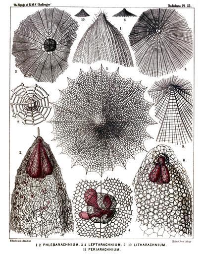 Keywords: Radiolaria (Challenger) Plate 055.jpg follows <table> <tr> <td style text-align center; vertical-align top; colspan 3 >Plate 55 Phænocalpida Anthocyrtida et Sethocyrtida </td> </tr> <tr> <td style font-size 85 ; text-align right; vertical-align top; colspan 3 >Diam </td> </tr> <tr> <td style vertical-align top; >Fig 1 Sethoconus facetus n sp vel Phlebarachnium facetum </td> <td style vertical-align bottom; >×</td> <td style text-align right; vertical-align bottom; >300</td> </tr> <tr> <td style font-size 85 ; padding-left 3em; text-indent -1em; vertical-align top; >Upper part of the shell </td> </tr> <tr> <td style vertical-align top; >Fig 2 Sethoconus venosus n sp vel Phlebarachnium venosum </td> <td style vertical-align bottom; >×</td> <td style text-align right; vertical-align bottom; >250</td> </tr> <tr> <td style font-size 85 ; padding-left 3em; text-indent -1em; vertical-align top; >Shell including the four-lobed central capsule </td> </tr> <tr> <td style vertical-align top; >Fig 3 Sethophormis aurelia n sp vel Leptarachnium aurelia </td> <td style vertical-align bottom; >×</td> <td style text-align right; vertical-align bottom; >100</td> </tr> <tr> <td style font-size 85 ; padding-left 3em; text-indent -1em; vertical-align top; >Shell seen from above </td> </tr> <tr> <td style vertical-align top; >Fig 4 Sethophormis aurelia n sp </td> <td style vertical-align bottom; >×</td> <td style text-align right; vertical-align bottom; >400</td> </tr> <tr> <td style font-size 85 ; padding-left 3em; text-indent -1em; vertical-align top; >Cephalis more enlarged with the enclosed four-lobed central capsule </td> </tr> <tr> <td style vertical-align top; >Fig 5 Cladarachnium ramosum n sp </td> <td style vertical-align bottom; >×</td> <td style text-align right; vertical-align bottom; >300</td> </tr> <tr> <td style font-size 85 ; padding-left 3em; text-indent -1em; vertical-align top; >Apical view </td> </tr> <tr> <td style vertical-align top; >Fig 6 Cladarachnium ramosum n sp </td> <td style vertical-align bottom; >×</td> <td style text-align right; vertical-align bottom; >70</td> </tr> <tr> <td style font-size 85 ; padding-left 3em; text-indent -1em; vertical-align top; >Lateral view </td> </tr> <tr> <td style vertical-align top; >Fig 7 Bathropyramis interrupta n sp </td> <td style vertical-align bottom; >×</td> <td style text-align right; vertical-align bottom; >300</td> </tr> <tr> <td style font-size 85 ; padding-left 3em; text-indent -1em; vertical-align top; >Apical part of the shell from above </td> </tr> <tr> <td style vertical-align top; >Fig 8 Litharachnium araneosum n sp </td> <td style vertical-align bottom; >×</td> <td style text-align right; vertical-align bottom; >300</td> </tr> <tr> <td style font-size 85 ; padding-left 3em; text-indent -1em; vertical-align top; >Apical part of the shell from above </td> </tr> <tr> <td style vertical-align top; >Fig 9 Litharachnium epeira n sp </td> <td style vertical-align bottom; >×</td> <td style text-align right; vertical-align bottom; >500</td> </tr> <tr> <td style font-size 85 ; padding-left 3em; text-indent -1em; vertical-align top; >Oblique view of the shell </td> </tr> <tr> <td style vertical-align top; >Fig 10 Litharachnium araneosum n sp </td> <td style vertical-align bottom; >×</td> <td style text-align right; vertical-align bottom; >50</td> </tr> <tr> <td style font-size 85 ; padding-left 3em; text-indent -1em; vertical-align top; >Lateral view </td> </tr> <tr> <td style vertical-align top; >Fig 11 Periarachnium periplectum n sp </td> <td style vertical-align bottom; >×</td> <td style text-align right; vertical-align bottom; >500</td> </tr> <tr> <td style font-size 85 ; padding-left 3em; text-indent -1em; vertical-align top; >Shell enclosing the trilobed central capsule </td> </tr> </table> https //archive org/details/reportonradiolar00haecrich 1887 Ernst Haeckel 1834-1919 ; engravings by Adolf Giltsch 1852-1911 PD-old-auto-1923 1919 Report on the Radiolaria |