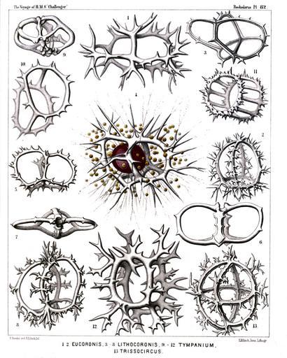 Keywords: Radiolaria (Challenger) Plate 082.jpg follows <table> <tr> <td style text-align center; vertical-align top; colspan 3 >Plate 82 Coronida et Tympanida </td> </tr> <tr> <td style font-size 85 ; text-align right; vertical-align top; colspan 3 >Diam </td> </tr> <tr> <td style vertical-align top; >Fig 1 Coronidium cervicorne n sp </td> <td style vertical-align bottom; >×</td> <td style text-align right; vertical-align bottom; >400</td> </tr> <tr> <td style font-size 85 ; padding-left 3em; text-indent -1em; vertical-align top; >Seen from the apical pole </td> </tr> <tr> <td style vertical-align top; >Fig 2 Coronidium acacia n sp </td> <td style vertical-align bottom; >×</td> <td style text-align right; vertical-align bottom; >300</td> </tr> <tr> <td style vertical-align top; >Fig 3 Eucoronis angulata n sp </td> <td style vertical-align bottom; >×</td> <td style text-align right; vertical-align bottom; >400</td> </tr> <tr> <td style font-size 85 ; padding-left 3em; text-indent -1em; vertical-align top; >Half from the apical half from the dorsal side </td> </tr> <tr> <td style vertical-align top; >Fig 4 Eucoronis challengeri n sp </td> <td style vertical-align bottom; >×</td> <td style text-align right; vertical-align bottom; >400</td> </tr> <tr> <td style font-size 85 ; padding-left 3em; text-indent -1em; vertical-align top; >The red central capsule encloses a large ovate nucleus and is surrounded by numerous xanthellæ </td> </tr> <tr> <td style vertical-align top; >Fig 5 Eucoronis nephrospyris n sp </td> <td style vertical-align bottom; >×</td> <td style text-align right; vertical-align bottom; >300</td> </tr> <tr> <td style vertical-align top; >Fig 6 Eucoronis perspicillum n sp </td> <td style vertical-align bottom; >×</td> <td style text-align right; vertical-align bottom; >300</td> </tr> <tr> <td style vertical-align top; >Fig 7 Coronidium dyostephanus n sp </td> <td style vertical-align bottom; >×</td> <td style text-align right; vertical-align bottom; >400</td> </tr> <tr> <td style font-size 85 ; padding-left 3em; text-indent -1em; vertical-align top; >Seen from the apical pole </td> </tr> <tr> <td style vertical-align top; >Fig 8 Coronidium diadema n sp </td> <td style vertical-align bottom; >×</td> <td style text-align right; vertical-align bottom; >300</td> </tr> <tr> <td style vertical-align top; >Fig 9 Acrocubus octopylus n sp </td> <td style vertical-align bottom; >×</td> <td style text-align right; vertical-align bottom; >300</td> </tr> <tr> <td style vertical-align top; >Fig 10 Parastephanus asymmetricus n sp </td> <td style vertical-align bottom; >×</td> <td style text-align right; vertical-align bottom; >400</td> </tr> <tr> <td style vertical-align top; >Fig 11 Eutympanium militare n sp </td> <td style vertical-align bottom; >×</td> <td style text-align right; vertical-align bottom; >400</td> </tr> <tr> <td style font-size 85 ; padding-left 3em; text-indent -1em; vertical-align top; >Oblique view </td> </tr> <tr> <td style vertical-align top; >Fig 12 Lithocubus astragalus n sp </td> <td style vertical-align bottom; >×</td> <td style text-align right; vertical-align bottom; >400</td> </tr> <tr> <td style vertical-align top; >Fig 13 Trissocircus globus n sp </td> <td style vertical-align bottom; >×</td> <td style text-align right; vertical-align bottom; >400</td> </tr> </table> https //archive org/details/reportonradiolar00haecrich 1887 Ernst Haeckel 1834-1919 ; engravings by Adolf Giltsch 1852-1911 PD-old-auto-1923 1919 Report on the Radiolaria |