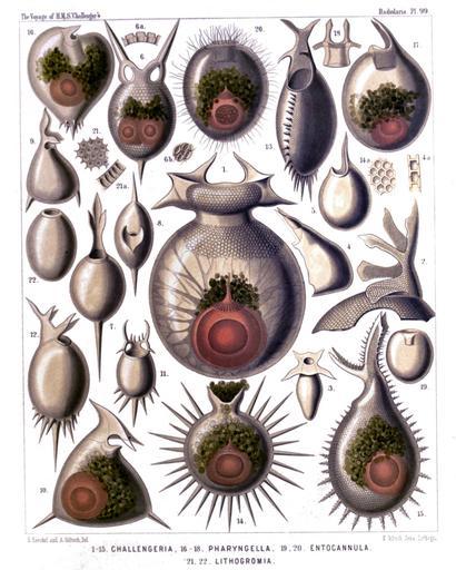 Keywords: Radiolaria (Challenger) Plate 099.jpg follows <table> <tr> <td style text-align center; vertical-align top; colspan 3 >Plate 99 Challengerida </td> </tr> <tr> <td style font-size 85 ; text-align right; vertical-align top; colspan 3 >Diam </td> </tr> <tr> <td style font-size 85 ; padding-left 3em; text-indent -1em; vertical-align top; > The central capsule is coloured red and the phæodium green in Figs 1 6 10 14-17 20 </td> </tr> <tr> <td style vertical-align top; >Fig 1 Challengeria murrayi n sp </td> <td style vertical-align bottom; >×</td> <td style text-align right; vertical-align bottom; >50</td> </tr> <tr> <td style font-size 85 ; padding-left 3em; text-indent -1em; vertical-align top; >From the dorsal side Numerous streams of sarcode arise from the central capsule and pierce the calymma inside the shell </td> </tr> <tr> <td style vertical-align top; >Fig 2 Challengeria wildi n sp </td> <td style vertical-align bottom; >×</td> <td style text-align right; vertical-align bottom; >400</td> </tr> <tr> <td style font-size 85 ; padding-left 3em; text-indent -1em; vertical-align top; >The peristome from the left side </td> </tr> <tr> <td style vertical-align top; >Fig 3 Challengeria bromleyi n sp </td> <td style vertical-align bottom; >×</td> <td style text-align right; vertical-align bottom; >400</td> </tr> <tr> <td style font-size 85 ; padding-left 3em; text-indent -1em; vertical-align top; >From the dorsal side </td> </tr> <tr> <td style vertical-align top; >Fig 4 Challengeria sloggettii John Murray</td> <td style vertical-align bottom; >×</td> <td style text-align right; vertical-align bottom; >150</td> </tr> <tr> <td style font-size 85 ; padding-left 3em; text-indent -1em; vertical-align top; >The ventral corner broken off From the left side </td> </tr> <tr> <td style font-size 85 ; padding-left 3em; text-indent -1em; vertical-align top; >Fig 4a Vertical section through the shell-wall </td> </tr> <tr> <td style vertical-align top; >Fig 5 Challengeria tritonis n sp </td> <td style vertical-align bottom; >×</td> <td style text-align right; vertical-align bottom; >150</td> </tr> <tr> <td style vertical-align top; >Fig 6 Challengeron diodon n sp </td> <td style vertical-align bottom; >×</td> <td style text-align right; vertical-align bottom; >400</td> </tr> <tr> <td style font-size 85 ; padding-left 3em; text-indent -1em; vertical-align top; >From the dorsal side The shell contains two central capsules </td> </tr> <tr> <td style vertical-align top; >Fig 7 Challengeron pearceyi n sp </td> <td style vertical-align bottom; >×</td> <td style text-align right; vertical-align bottom; >300</td> </tr> <tr> <td style font-size 85 ; padding-left 3em; text-indent -1em; vertical-align top; >From the dorsal side </td> </tr> <tr> <td style vertical-align top; >Fig 8 Challengeron richardsii n sp </td> <td style vertical-align bottom; >×</td> <td style text-align right; vertical-align bottom; >100</td> </tr> <tr> <td style font-size 85 ; padding-left 3em; text-indent -1em; vertical-align top; >From the oral margin</td> </tr> <tr> <td style vertical-align top; >Fig 9 Challengeron fergusoni n sp </td> <td style vertical-align bottom; >×</td> <td style text-align right; vertical-align bottom; >100</td> </tr> <tr> <td style font-size 85 ; padding-left 3em; text-indent -1em; vertical-align top; >From the right side </td> </tr> <tr> <td style vertical-align top; >Fig 10 Challengeron triangulum n sp </td> <td style vertical-align bottom; >×</td> <td style text-align right; vertical-align bottom; >200</td> </tr> <tr> <td style font-size 85 ; padding-left 3em; text-indent -1em; vertical-align top; >From the right side </td> </tr> <tr> <td style vertical-align top; >Fig 11 Challengeron crosbiei n sp </td> <td style vertical-align bottom; >×</td> <td style text-align right; vertical-align bottom; >300</td> </tr> <tr> <td style font-size 85 ; padding-left 3em; text-indent -1em; vertical-align top; >From the ventral side </td> </tr> <tr> <td style vertical-align top; >Fig 12 Challengeron buchanani n sp </td> <td style vertical-align bottom; >×</td> <td style text-align right; vertical-align bottom; >300</td> </tr> <tr> <td style font-size 85 ; padding-left 3em; text-indent -1em; vertical-align top; >From the right side </td> </tr> <tr> <td style vertical-align top; >Fig 13 Challengeron willemoesii n sp </td> <td style vertical-align bottom; >×</td> <td style text-align right; vertical-align bottom; >400</td> </tr> <tr> <td style font-size 85 ; padding-left 3em; text-indent -1em; vertical-align top; >From the ventral side </td> </tr> <tr> <td style vertical-align top; >Fig 14 Challengeron moseleyi n sp </td> <td style vertical-align bottom; >×</td> <td style text-align right; vertical-align bottom; >300</td> </tr> <tr> <td style font-size 85 ; padding-left 3em; text-indent -1em; vertical-align top; >From the right side </td> </tr> <tr> <td style vertical-align top; >Fig 15 Challengeron wyvillei n sp </td> <td style vertical-align bottom; >×</td> <td style text-align right; vertical-align bottom; >300</td> </tr> <tr> <td style font-size 85 ; padding-left 3em; text-indent -1em; vertical-align top; >From the left side </td> </tr> <tr> <td style vertical-align top; >Fig 16 Porcupinia cordiformis n sp </td> <td style vertical-align bottom; >×</td> <td style text-align right; vertical-align bottom; >200</td> </tr> <tr> <td style font-size 85 ; padding-left 3em; text-indent -1em; vertical-align top; >From the right side </td> </tr> <tr> <td style vertical-align top; >Fig 17 Pharyngella gastræa n sp </td> <td style vertical-align bottom; >×</td> <td style text-align right; vertical-align bottom; >150</td> </tr> <tr> <td style vertical-align top; >Fig 18 Pharyngella gastrula n sp </td> <td style vertical-align bottom; >×</td> <td style text-align right; vertical-align bottom; >150</td> </tr> <tr> <td style vertical-align top; >Fig 19 Entocannula infundibulum n sp </td> <td style vertical-align bot