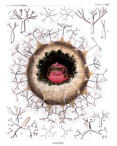 | Keywords: Radiolaria (Challenger) Plate 102.jpg follows <table> <tr> <td style text-align center; vertical-align top; colspan 3 >Plate 102 Aulacanthida </td> </tr> <tr> <td style font-size 85 ; text-align right; vertical-align top; colspan 3 >Diam </td> </tr> <tr> <td style vertical-align top; >Fig 1 Auloceros elegans n sp </td> <td style vertical-align bottom; >×</td> <td style text-align right; vertical-align bottom; >80</td> </tr> <tr> <td style font-size 85 ; padding-left 3em; text-indent -1em; vertical-align top; >A complete specimen observed living at Ceylon In the centre is visible the red central capsule with its three openings containing a large nucleus of half the size with numerous nucleoli The alveolate calymma encloses a green excentric phæodium is surrounded by a veil of interwoven tangential needles and forms conical elevations which enclose the piercing radial tubes Between these radiate numerous pseudopodia compare for the single parts Pl 103 fig 1 and Pl 104 figs 1-3 and their explanation </td> </tr> <tr> <td style vertical-align top; >Figs 2-6 Auloceros furcosus n sp </td> <td style vertical-align bottom; >×</td> <td style text-align right; vertical-align bottom; >100</td> </tr> <tr> <td style font-size 85 ; padding-left 3em; text-indent -1em; vertical-align top; >Distal ends of different radial tubes exhibiting the great variability of this species </td> </tr> <tr> <td style vertical-align top; >Fig 7 Auloceros trigeminus n sp </td> <td style vertical-align bottom; >×</td> <td style text-align right; vertical-align bottom; >300</td> </tr> <tr> <td style font-size 85 ; padding-left 3em; text-indent -1em; vertical-align top; >Distal end of a single tube </td> </tr> <tr> <td style vertical-align top; >Fig 8 Auloceros capreolus n sp </td> <td style vertical-align bottom; >×</td> <td style text-align right; vertical-align bottom; >200</td> </tr> <tr> <td style font-size 85 ; padding-left 3em; text-indent -1em; vertical-align top; >Distal End of a Single Tube </td> </tr> <tr> <td style vertical-align top; >Figs 9 10 Auloceros cervinus n sp </td> <td style vertical-align bottom; >×</td> <td style text-align right; vertical-align bottom; >300</td> </tr> <tr> <td style font-size 85 ; padding-left 3em; text-indent -1em; vertical-align top; >Distal ends of two single tubes </td> </tr> <tr> <td style vertical-align top; >Fig 12 Auloceros spathillaster n sp </td> <td style vertical-align bottom; >×</td> <td style text-align right; vertical-align bottom; >300</td> </tr> <tr> <td style font-size 85 ; padding-left 3em; text-indent -1em; vertical-align top; >Distal end of a single tube </td> </tr> <tr> <td style vertical-align top; >Figs 11 13 Auloceros arborescens n sp </td> <td style vertical-align bottom; >×</td> <td style text-align right; vertical-align bottom; >300</td> </tr> <tr> <td style font-size 85 ; padding-left 3em; text-indent -1em; vertical-align top; >Distal ends of two single tubes </td> </tr> </table> https //archive org/details/reportonradiolar00haecrich 1887 Ernst Haeckel 1834-1919 ; engravings by Adolf Giltsch 1852-1911 PD-old-auto-1923 1919 Report on the Radiolaria |