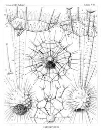 | Keywords: Radiolaria (Challenger) Plate 112.jpg follows <table> <tr> <td style text-align center; vertical-align top; colspan 3 >Plate 112 Cannosphærida </td> </tr> <tr> <td style font-size 85 ; text-align right; vertical-align top; colspan 3 >Diam </td> </tr> <tr> <td style font-size 85 ; padding-left 3em; text-indent -1em; vertical-align top; >Cannosphærida </td> </tr> <tr> <td style vertical-align top; >Fig 1 Cannosphæra antarctica n sp </td> <td style vertical-align bottom; >×</td> <td style text-align right; vertical-align bottom; >50</td> </tr> <tr> <td style font-size 85 ; padding-left 3em; text-indent -1em; vertical-align top; >The entire shell The inner mammillate shell from the month of which is prominent the phæodium in connected by numerous radial beams with the outer shell </td> </tr> <tr> <td style vertical-align top; >Fig 2 Cannosphæra antarctica n sp </td> <td style vertical-align bottom; >×</td> <td style text-align right; vertical-align bottom; >200</td> </tr> <tr> <td style font-size 85 ; padding-left 3em; text-indent -1em; vertical-align top; >The inner shell from the mouth of which is prominent the phæodium and a single hexagonal mesh of the outer shell connected with the former by thin radial threads </td> </tr> <tr> <td style vertical-align top; >Fig 3 Cannosphæra antarctica n sp </td> <td style vertical-align bottom; >×</td> <td style text-align right; vertical-align bottom; >200</td> </tr> <tr> <td style font-size 85 ; padding-left 3em; text-indent -1em; vertical-align top; >A single radial spine with four terminal branches </td> </tr> <tr> <td style vertical-align top; >Fig 4 Cannosphæra pacifica n sp </td> <td style vertical-align bottom; >×</td> <td style text-align right; vertical-align bottom; >200</td> </tr> <tr> <td style font-size 85 ; padding-left 3em; text-indent -1em; vertical-align top; >The inner shell exhibiting on its base the widely open mouth and in its upper half the transparent spherical central capsule with its nucleus Of the outer shell which is connected with the inner by thin radial threads only a few polygonal meshes are visible </td> </tr> <tr> <td style vertical-align top; >Fig 5 Cannosphæra atlantica n sp </td> <td style vertical-align bottom; >×</td> <td style text-align right; vertical-align bottom; >200</td> </tr> <tr> <td style font-size 85 ; padding-left 3em; text-indent -1em; vertical-align top; >The inner shell connected by spiny radial beams with the outer shell a quadrant only of which is visible </td> </tr> <tr> <td style vertical-align top; >Fig 6 Cannosphæra atlantica n sp </td> <td style vertical-align bottom; >×</td> <td style text-align right; vertical-align bottom; >200</td> </tr> <tr> <td style font-size 85 ; padding-left 3em; text-indent -1em; vertical-align top; >A single radial spine with five terminal branches </td> </tr> </table> https //archive org/details/reportonradiolar00haecrich 1887 Ernst Haeckel 1834-1919 ; engravings by Adolf Giltsch 1852-1911 PD-old-auto-1923 1919 Report on the Radiolaria |
