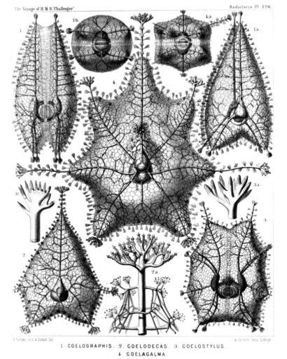 Keywords: Radiolaria (Challenger) Plate 126.jpg follows <table> <tr> <td style text-align center; vertical-align top; colspan 3 >Plate 126 Cœlographida </td> </tr> <tr> <td style font-size 85 ; text-align right; vertical-align top; colspan 3 >Diam </td> </tr> <tr> <td style vertical-align top; >Figs 1-1c Cœlographis regina n sp </td> </tr> <tr> <td style font-size 85 ; padding-left 3em; text-indent -1em; vertical-align top; >Fig 1 Lateral view The central capsule it visible between the two valves of the inner shell the galeæ of which are filled by the phæodium </td> <td style vertical-align bottom; >×</td> <td style text-align right; vertical-align bottom; >20</td> </tr> <tr> <td style font-size 85 ; padding-left 3em; text-indent -1em; vertical-align top; >Fig 1a Dorsal view somewhat obliquely from the left side The galeæ appear triangular </td> <td style vertical-align bottom; >×</td> <td style text-align right; vertical-align bottom; >20</td> </tr> <tr> <td style font-size 85 ; padding-left 3em; text-indent -1em; vertical-align top; >Fig 1b Basal view </td> <td style vertical-align bottom; >×</td> <td style text-align right; vertical-align bottom; >20</td> </tr> <tr> <td style font-size 85 ; padding-left 3em; text-indent -1em; vertical-align top; >Fig 1c Distal end of a style </td> <td style vertical-align bottom; >×</td> <td style text-align right; vertical-align bottom; >300</td> </tr> <tr> <td style vertical-align top; >Figs 2-2b Cœlodecas sagittaria n sp </td> </tr> <tr> <td style font-size 85 ; padding-left 3em; text-indent -1em; vertical-align top; >Fig 2 One valve of the shell seen from the outside </td> <td style vertical-align bottom; >×</td> <td style text-align right; vertical-align bottom; >30</td> </tr> <tr> <td style font-size 85 ; padding-left 3em; text-indent -1em; vertical-align top; >Fig 2a Distal end of a style </td> <td style vertical-align bottom; >×</td> <td style text-align right; vertical-align bottom; >300</td> </tr> <tr> <td style vertical-align top; >Figs 3-3a Cœlostylus bisenarius n sp </td> </tr> <tr> <td style font-size 85 ; padding-left 3em; text-indent -1em; vertical-align top; >Fig 3 Lateral view of the bivalved shell The central capsule is visible between the two valves of the inner shell the galeæ of which are filled by the phæodium </td> <td style vertical-align bottom; >×</td> <td style text-align right; vertical-align bottom; >20</td> </tr> <tr> <td style font-size 85 ; padding-left 3em; text-indent -1em; vertical-align top; >Fig 3a Distal end of a style </td> <td style vertical-align bottom; >×</td> <td style text-align right; vertical-align bottom; >300</td> </tr> <tr> <td style vertical-align top; >Figs 4-4a Cœlagalma mirabile n sp </td> </tr> <tr> <td style font-size 85 ; padding-left 3em; text-indent -1em; vertical-align top; >Fig 4 Dorsal view of the bivalved shell </td> <td style vertical-align bottom; >×</td> <td style text-align right; vertical-align bottom; >30</td> </tr> <tr> <td style font-size 85 ; padding-left 3em; text-indent -1em; vertical-align top; >Fig 4a Basal view of the bivalved shell </td> <td style vertical-align bottom; >×</td> <td style text-align right; vertical-align bottom; >10</td> </tr> </table> https //archive org/details/reportonradiolar00haecrich 1887 Ernst Haeckel 1834-1919 ; engravings by Adolf Giltsch 1852-1911 PD-old-auto-1923 1919 Report on the Radiolaria |