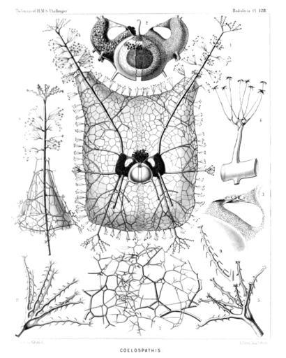 | Keywords: Radiolaria (Challenger) Plate 128.jpg follows <table> <tr> <td style text-align center; vertical-align top; colspan 3 >Plate 128 Cœlographida </td> </tr> <tr> <td style font-size 85 ; text-align right; vertical-align top; colspan 3 >Diam </td> </tr> <tr> <td style vertical-align top; >Fig 1 Cœlospathis ancorata n sp </td> <td style vertical-align bottom; >×</td> <td style text-align right; vertical-align bottom; >50</td> </tr> <tr> <td style font-size 85 ; padding-left 3em; text-indent -1em; vertical-align top; >Lateral view of the entire shell The central capsule is visible between the two valves of the inner shell The galeæ and rhinocannæ of the two inner valves are filled up by the black phæodium </td> </tr> <tr> <td style vertical-align top; >Fig 2 Cœlospathis ancorata n sp </td> <td style vertical-align bottom; >×</td> <td style text-align right; vertical-align bottom; >100</td> </tr> <tr> <td style font-size 85 ; padding-left 3em; text-indent -1em; vertical-align top; >The two valves of the inner shell; the galeæ and rhinocannæ of which are filled up by the black phæodium Between the mouth of the two rhinocannæ is prominent the proboscis of the astropyle arising from the radiate operculum of the central capsule The latter contains numerous crystals and a big dark nucleus Lateral view </td> </tr> <tr> <td style vertical-align top; >Fig 3 Cœlospathis ancorata n sp </td> <td style vertical-align bottom; >×</td> <td style text-align right; vertical-align bottom; >200</td> </tr> <tr> <td style font-size 85 ; padding-left 3em; text-indent -1em; vertical-align top; >The rhinocanna or the nasal tube of one valve and the latticed frenulum which connects its mouth with the top of the galea </td> </tr> <tr> <td style vertical-align top; >Fig 4 Cœlospathis ancorata n sp </td> <td style vertical-align bottom; >×</td> <td style text-align right; vertical-align bottom; >80</td> </tr> <tr> <td style font-size 85 ; padding-left 3em; text-indent -1em; vertical-align top; >Distal end of a style </td> </tr> <tr> <td style vertical-align top; >Fig 5 Cœlospathis ancorata n sp </td> <td style vertical-align bottom; >×</td> <td style text-align right; vertical-align bottom; >200</td> </tr> <tr> <td style font-size 85 ; padding-left 3em; text-indent -1em; vertical-align top; >Terminal branches of a style </td> </tr> <tr> <td style vertical-align top; >Fig 6 Cœlospathis ancorata n sp </td> <td style vertical-align bottom; >×</td> <td style text-align right; vertical-align bottom; >600</td> </tr> <tr> <td style font-size 85 ; padding-left 3em; text-indent -1em; vertical-align top; >Lateral branch of a style with an anchor-pencil </td> </tr> <tr> <td style vertical-align top; >Fig 7 Cœlospathis ancorata n sp </td> <td style vertical-align bottom; >×</td> <td style text-align right; vertical-align bottom; >300</td> </tr> <tr> <td style font-size 85 ; padding-left 3em; text-indent -1em; vertical-align top; >The lateral margins of the latticed valves of the outer shell or mantle catching into one another without being connected directly </td> </tr> <tr> <td style vertical-align top; >Fig 8 Cœlospathis octostyla n sp </td> <td style vertical-align bottom; >×</td> <td style text-align right; vertical-align bottom; >300</td> </tr> <tr> <td style font-size 85 ; padding-left 3em; text-indent -1em; vertical-align top; >Terminal branches of a style </td> </tr> <tr> <td style vertical-align top; >Fig 9 Cœlospathis octodactyla n sp </td> <td style vertical-align bottom; >×</td> <td style text-align right; vertical-align bottom; >400</td> </tr> <tr> <td style font-size 85 ; padding-left 3em; text-indent -1em; vertical-align top; >A single terminal branch of a style </td> </tr> </table> https //archive org/details/reportonradiolar00haecrich 1887 Ernst Haeckel 1834-1919 ; engravings by Adolf Giltsch 1852-1911 PD-old-auto-1923 1919 Report on the Radiolaria |