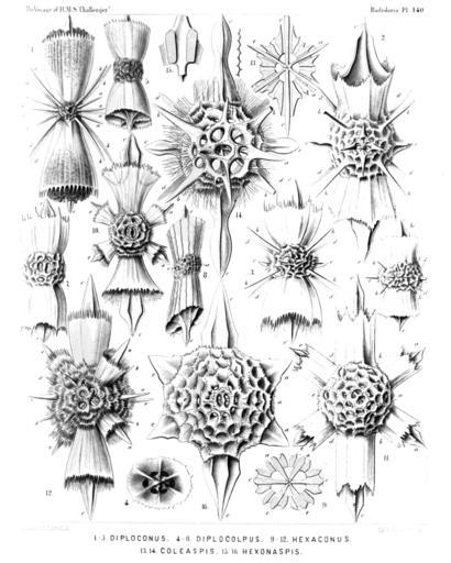 | Keywords: Radiolaria (Challenger) Plate 140.jpg follows <table> <tr> <td style text-align center; vertical-align top; colspan 3 >Plate 140 Belonaspida Hexalaspida et Diploconida </td> </tr> <tr> <td style font-size 85 ; text-align right; vertical-align top; colspan 3 >Diam </td> </tr> <tr> <td style vertical-align top; >Fig 1 Diploconus amalla n sp </td> <td style vertical-align bottom; >×</td> <td style text-align right; vertical-align bottom; >300</td> </tr> <tr> <td style vertical-align top; >Fig 2 Diploconus hexaphyllus n sp </td> <td style vertical-align bottom; >×</td> <td style text-align right; vertical-align bottom; >300</td> </tr> <tr> <td style vertical-align top; >Fig 3 Diploconus cyathiscus n sp </td> <td style vertical-align bottom; >×</td> <td style text-align right; vertical-align bottom; >300</td> </tr> <tr> <td style vertical-align top; >Fig 4 Diploconus cotyliscus n sp </td> <td style vertical-align bottom; >×</td> <td style text-align right; vertical-align bottom; >400</td> </tr> <tr> <td style font-size 85 ; padding-left 3em; text-indent -1em; vertical-align top; >Polar view </td> </tr> <tr> <td style vertical-align top; >Fig 5 Diplocolpus serratus n sp </td> <td style vertical-align bottom; >×</td> <td style text-align right; vertical-align bottom; >300</td> </tr> <tr> <td style vertical-align top; >Fig 6 Diplocolpus cristatus n sp </td> <td style vertical-align bottom; >×</td> <td style text-align right; vertical-align bottom; >400</td> </tr> <tr> <td style vertical-align top; >Fig 7 Diplocolpus costatus n sp </td> <td style vertical-align bottom; >×</td> <td style text-align right; vertical-align bottom; >400</td> </tr> <tr> <td style vertical-align top; >Fig 8 Diplocolpus sulcatus n sp </td> <td style vertical-align bottom; >×</td> <td style text-align right; vertical-align bottom; >300</td> </tr> <tr> <td style vertical-align top; >Fig 9 Diplocolpus dentatus n sp </td> <td style vertical-align bottom; >×</td> <td style text-align right; vertical-align bottom; >300</td> </tr> <tr> <td style font-size 85 ; padding-left 3em; text-indent -1em; vertical-align top; >Meridional section through the centre of the shell </td> </tr> <tr> <td style vertical-align top; >Fig 10 Hexacolpus infundibulum n sp </td> <td style vertical-align bottom; >×</td> <td style text-align right; vertical-align bottom; >300</td> </tr> <tr> <td style vertical-align top; >Fig 11 Hexacolpus trypanon n sp </td> <td style vertical-align bottom; >×</td> <td style text-align right; vertical-align bottom; >300</td> </tr> <tr> <td style vertical-align top; >Fig 12 Hexaconus echinatus n sp </td> <td style vertical-align bottom; >×</td> <td style text-align right; vertical-align bottom; >300</td> </tr> <tr> <td style vertical-align top; >Fig 13 Coleaspis vaginata n sp </td> <td style vertical-align bottom; >×</td> <td style text-align right; vertical-align bottom; >300</td> </tr> <tr> <td style font-size 85 ; padding-left 3em; text-indent -1em; vertical-align top; >Meridional section through the shell </td> </tr> <tr> <td style vertical-align top; >Fig 14 Coleaspis hydrotomica n sp </td> <td style vertical-align bottom; >×</td> <td style text-align right; vertical-align bottom; >400</td> </tr> <tr> <td style vertical-align top; >Fig 15 Hexonaspis hexapleura n sp </td> <td style vertical-align bottom; >×</td> <td style text-align right; vertical-align bottom; >400</td> </tr> <tr> <td style font-size 85 ; padding-left 3em; text-indent -1em; vertical-align top; >A single spine with its thick apophyses </td> </tr> <tr> <td style vertical-align top; >Fig 16 Hexonaspis hastata n sp </td> <td style vertical-align bottom; >×</td> <td style text-align right; vertical-align bottom; >400</td> </tr> </table> https //archive org/details/reportonradiolar00haecrich 1887 Ernst Haeckel 1834-1919 ; engravings by Adolf Giltsch 1852-1911 PD-old-auto-1923 1919 Report on the Radiolaria |