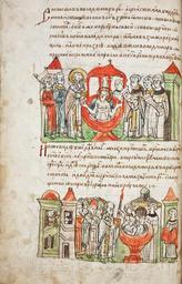 | Keywords: Radzivill Chronicle 02.jpg Список экспонатов РАДЗИВИЛОВСКАЯ ЛЕТОПИСЬ Конец XV века 251 л Бумага че нила кинова ь темпе а 31 5 х 21 Поступила в 1761 году С се едины XVII века собственность князей Радзивиллов Богуславом Радзивиллом была завещана Кенигсбе гской библиотеке куда поступила в 1671 году В 1758 году по специальному ходатайству Импе ато ской академии наук и за подписью импе ат ицы Елизаветы Пет овны летопись была п ислана из Кенигсбе га в Санкт-Пете бу г БРА инв ОС 34 5 30 а этой миниатю е К ещение святого Владими а в 988 году http //www svyatayarus ru/data/manuscripts/7_radzivilovskaya_letopis/index php svyatayarus ru; http //mini-site louvre fr/sainte-russie/EN/html/1 1 html mini-site louvre fr 15 c anonymous PD-Art Radzivill Chronicle Vladimir I of Kiev in miniature Exhibition Sainte Russie Moscow 2011 - books Files uploaded by Shakko from various sources |