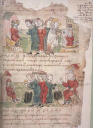 | Keywords: Radzivill chronicle List2.jpg Радзивилловская летопись л 8r иниатю ы Об ащение болга к византийскому импе ато у ихаилу с п осьбой к естить их; к ещение болга п и ца е ихаиле наве ху Tекст из Радзивиловской летописи Болга е же увидевше яко не могоше стати п отиву к еститися п осиша и поко итися г еком Ца же к ести княза их и боля ы вся Плата дани славянами к ивичами и чюдью ва ягам а полянами севе янами и вятичами хаза ам; азме дани белка и девица от дыма внизу Tекст из Радзивиловской летописи Имаху дань ва язи из замо ия в чюди на словенех на ме ях и на всех к ивичех А коза е имаху на полех и на севе е и на вятичех имаху по беле и девеци от дыма Лите ату а Кукушкина Радзивиловская летопись Текст Исследование Описание миниатю ст 305-306 Michael mit der Bitte sie zu taufen; die Taufe der Bulgaren oben Text aus der Radziwiłł-Chronik Kaiser Michail zog mit seinen Kriegern zu Lande und zu Wasser gegen die Bulgaren Die Bulgaren aber die sahen daß sie ihm nicht widerstehen konnten baten darum getauft zu werden und untewarfen sich den Griechen Der Kaiser taufte nun ihren Fürsten und alle Bojaren und schloß Frieden mit den Bulgaren Graßhoff Freydank Sturm Rauchspur der Tauben Radziwiłł-Chronik S 31 Die Tschuden Slowenen Meriern Wessen und Kriwitschen zahlen Tribut an die Waräger die Poljanen Sewerjanen und Wjatitschen an die Chasaren unten Text aus der Radziwiłł-Chronik Die Waräger von jenseits des Meeres erhoben Tribut von den Tschuden Slowenen Meriern Wessen und Kriwitschen Und die Chasaren erhoben Tribut von den Poljanen und Sewerjanen und Wjatitschen Sie nahmen ein weißes Eichhörnchenfell von jedem Rauchfang Graßhoff Freydank Sturm Rauchspur der Tauben Radziwiłł-Chronik S 31 en Radziwiłł Chronicle http //bibliotekar ru/rus/95 htm bibliotekar ru http //radzivil chat ru/ radzivil chat ru from the Middle Ages unknown century 15 <gallery> File RadzivillChronicleFol8r jpg File RadzivillChronicleFol8ra jpg File RadzivillChronicleFol8rb jpg </gallery> PD-Art Radzivill Chronicle Christianization of Bulgaria Michael III Paintings of baptism Bulgarians in Medieval art Varangians Khazars Mari people |
