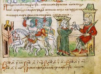 | Keywords: RadzivillChronicleFol21rb.jpg Радзивилловская летопись л 21r детайл иниатю а Поход болга ского ца я Симеона на Ца ыг ад 922-924 и заключение ми а с импе ато ом Романом I Tекст из Радзивиловской летописи П ииде Семион на Ца ыг ад и поплени Ф акию и акидонию и п ииде ко Ца юг аду в силе велице и в го дости и сотво и ми с Романом ца ем Лите ату а Кукушкина Радзивиловская летопись Текст Исследование Описание миниатю ст 310 Simeon's Feldzug gegen Konstantinopel 922-924 und Abschluss eines Friedensvertrages mit dem byzantinischen Kaiser Romanos Text aus der Radziwiłł-Chronik Simeon zog gegen Zargrad und verheerte Thrakien und Makedonien; mit einer großen Streitmacht und voller Stolz rückte er vor Zargrad und schloß Frieden mit dem Kaiser Romanos und kehrte dann wieder zurück Graßhoff Freydank Sturm Rauchspur der Tauben Radziwiłł-Chronik S 51 O imperador bizantino Romano I negociando com Simão I da Bulgária c 922-924 Iluminura da Crónica de Radzivill do século XV Byzantine Emperor Romanos I Lekapenos negociating with Simeon I of Bulgaria c 922-924 miniature of the Radziwill Chronicle 15<sup>th</sup> century en Radziwiłł Chronicle century 15 from the Middle Ages unknown <gallery> File RadzivillChronicleFol21r jpg </gallery> PD-Art Details of Radzivill Chronicle Romanos I Lekapenos Simeon I of Bulgaria Bulgarians in Medieval art Sieges of Constantinople 920s |