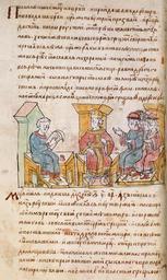 | Keywords: RadzivillChronicleFol39v.jpg Радзивилловская летопись л 39v иниатю a П ием византийским импе ато ом Иоанном Цимисхием послов Святослава Иго евича Писец записывает на пе гаменте условия ми ного догово а п едложенного г екам усской сто оной Tекст из Радзивиловской летописи Посла лепшие ко ца еви и п иидоша в Де ъст Ца ь же ад быв и повеле писцю писати вся ечи Святослава на хо атьи ача глаголать посол вся ечи нача писец писати Лите ату а Кукушкина Радзивиловская летопись Текст Исследование Описание миниатю ст 318 Johannes Tzimiskes empfängt Botschafter des russischen Großfürsten Swjatoslaw I und diktiert die Bedingungen eines Friedensvertrages Text aus der Radziwiłł-Chronik Und er schickte Gesandte zum Kaiser nach Dorostorum Da freute sich der Kaiser und befahl dem Schreiber alle Worte Swjatoslaws auf Pergament niederzuschreiben Und ein Gesandter begann alle Reden vorzutragen der Schreiber begann zu schreiben Graßhoff Freydank Sturm Rauchspur der Tauben Radziwiłł-Chronik S 80 en Radziwiłł Chronicle from the Middle Ages unknown century 15 PD-Art Radzivill Chronicle Sviatoslav I of Kiev in medieval miniatures Ioannes I Tzimiskes Sviatoslav's invasion of Bulgaria History of Silistra |