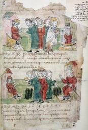 | Keywords: RadzivillChronicleFol8r.jpg Радзивилловская летопись л 8r иниатю ы Об ащение болга к византийскому импе ато у ихаилу с п осьбой к естить их; к ещение болга п и ца е ихаиле наве ху Tекст из Радзивиловской летописи Болга е же увидевше яко не могоше стати п отиву к еститися п осиша и поко итися г еком Ца же к ести княза их и боля ы вся Плата дани славянами к ивичами и чюдью ва ягам а полянами севе янами и вятичами хаза ам; азме дани белка и девица от дыма внизу Tекст из Радзивиловской летописи Имаху дань ва язи из замо ия в чюди на словенех на ме ях и на всех к ивичех А коза е имаху на полех и на севе е и на вятичех имаху по беле и девеци от дыма Лите ату а Кукушкина Радзивиловская летопись Текст Исследование Описание миниатю ст 305-306 Michael mit der Bitte sie zu taufen; die Taufe der Bulgaren oben Text aus der Radziwiłł-Chronik Kaiser Michail zog mit seinen Kriegern zu Lande und zu Wasser gegen die Bulgaren Die Bulgaren aber die sahen daß sie ihm nicht widerstehen konnten baten darum getauft zu werden und untewarfen sich den Griechen Der Kaiser taufte nun ihren Fürsten und alle Bojaren und schloß Frieden mit den Bulgaren Graßhoff Freydank Sturm Rauchspur der Tauben Radziwiłł-Chronik S 31 Die Tschuden Slowenen Meriern Wessen und Kriwitschen zahlen Tribut an die Waräger die Poljanen Sewerjanen und Wjatitschen an die Chasaren unten Text aus der Radziwiłł-Chronik Die Waräger von jenseits des Meeres erhoben Tribut von den Tschuden Slowenen Meriern Wessen und Kriwitschen Und die Chasaren erhoben Tribut von den Poljanen und Sewerjanen und Wjatitschen Sie nahmen ein weißes Eichhörnchenfell von jedem Rauchfang Graßhoff Freydank Sturm Rauchspur der Tauben Radziwiłł-Chronik S 31 en Radziwiłł Chronicle http //bibliotekar ru/rus/95 htm bibliotekar ru http //radzivil chat ru/ radzivil chat ru from the Middle Ages unknown century 15 <gallery> File RadzivillChronicleFol8ra jpg File RadzivillChronicleFol8rb jpg File Radzivill chronicle List2 jpg </gallery> PD-Art Radzivill Chronicle Christianization of Bulgaria Michael III Paintings of baptism Bulgarians in Medieval art Varangians Khazars Mari people |