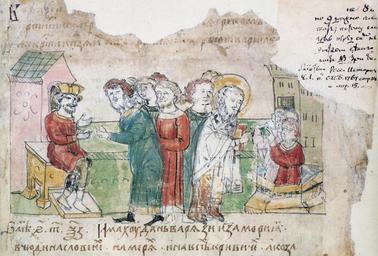 | Keywords: RadzivillChronicleFol8ra.jpg Радзивилловская летопись л 8ra детаил иниатю a Об ащение болга к византийскому импе ато у ихаилу с п осьбой к естить их; к ещение болга п и ца е ихаиле Tекст из Радзивиловской летописи Болга е же увидевше яко не могоше стати п отиву к еститися п осиша и поко итися г еком Ца же к ести княза их и боля ы вся Лите ату а Кукушкина Радзивиловская летопись Текст Исследование Описание миниатю ст 305 Michael mit der Bitte sie zu taufen; die Taufe der Bulgaren Text aus der Radziwiłł-Chronik Kaiser Michail zog mit seinen Kriegern zu Lande und zu Wasser gegen die Bulgaren Die Bulgaren aber die sahen daß sie ihm nicht widerstehen konnten baten darum getauft zu werden und untewarfen sich den Griechen Der Kaiser taufte nun ihren Fürsten und alle Bojaren und schloß Frieden mit den Bulgaren Graßhoff Freydank Sturm Rauchspur der Tauben Radziwiłł-Chronik S 31 en Radziwiłł Chronicle from the Middle Ages unknown century 15 <gallery> File RadzivillChronicleFol8r jpg </gallery> PD-Art Details of Radzivill Chronicle Christianization of Bulgaria Michael III Paintings of baptism Bulgarians in Medieval art |