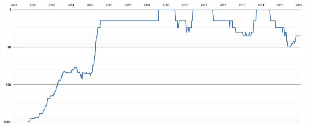 | Keywords: Rafael-Nadal-Singles-Ranking-History-Chart-2001-2015.png Rafael Nadal Singles Ranking History Overview Chart 2001-2015 <br /> <br /> Note official ATP table has 1 missing data entry point for the following week '2012 07 02' 2nd July 2012 citing an erroneous rank of 0 which is not technically possible for an intermediate week between several continuous and consecutive weeks that precedes and follows it Thus to prevent a discontinuity in the chart I have manually entered an assumed ranking of '2' which coincides with Novak Djokovic fall to rank place no 2 and Roger Federer rise to place no 1 next week but since this week no ATP points change occurred I decided to keep their ranking unchanged When the data table gets a proper revision chart will be corrected self-made based on this URL http //www atpworldtour com/en/players/rafael-nadal/n409/rankings-history created 17 Jul 2015 Darko A7 Darko A7 wikipedia en Cc-zero Original upload log en wikipedia Rafael-Nadal-Singles-Ranking-History-Chart-2001-2015 png wikitable - 2015-09-14 22 53 1224×500× 15328 bytes Darko A7 <nowiki>simplified x-axis</nowiki> - 2015-09-14 22 41 1224×500× 15394 bytes Darko A7 <nowiki>Re-aligned Human-readable X-axis</nowiki> - 2015-09-14 22 07 1224×500× 15290 bytes Darko A7 <nowiki>Updated Ranking 9/15/2015</nowiki> - 2015-07-17 03 57 988×500× 13678 bytes Darko A7 <nowiki>Fixed chart line discontinuity error introduced by image editing software and color bit-depth conversion </nowiki> - 2015-07-17 03 47 1060×500× 9382 bytes Darko A7 <nowiki> Summary Rafael Nadal Singles Ranking History Overview Chart 2001-2015 <br /> <br /> Note official ATP table has 1 missing data entry point for the following week '2012 07 02' 2nd July 2012 citing an erroneou </nowiki> Uncategorized 2015 September 19 |