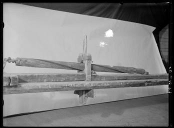 | Keywords: Räffelbänk, 1700-talets slut, från smedja i Sundets by, Råneå - Livrustkammaren - 18125.tif Bänk av obehandlad grovhyvlad furu l ca 4000 mm b ca 300 mm sammansatt av två bräder b 150 mm tjocklek 60 mm Två intappade utåtställda benpar h 450 och 510 mm det bakre kraftigare och försett med tvärslå och stödbräda på bänkens undersida Ca 100 mm från framänden fastspikat en uppstående träplatta med konturerad överkant och skålat stöd för bösspipan <br/><br/>Ca 500 mm därbakom fästanordning för pipan bestående av stock h 350 mm inkl tapp b 150 mm tjocklek 100 mm fäst med tapp genom bänken På stockens översida en stålbygel för fästskruv för pipan ringformigt huvud Under skruven på stocken en stålplatta med stopplist baktill och vid vardera sidan ett runt hål för styrpinnar plattans framände nedåtböjd över stockens framsida <br/><br/>Från fästanordningen löper på bänkens ovansida en bräda b 115 mm fäst med kraftiga stålspikar Ca 1500 mm bakom pipfästet en styranordning för räffelstocken bestående av en träplatta h 350 mm inkl tapp b 140 mm tjocklek 50 mm likaså fäst med tapp genom bänken I plattan ett runt hål d 80 mm med snedställd styrlist nertill styrningen upptill genom en grovskuren urtagbar träpinne l 270 mm Plattan spräckt upptill på framsidan och förstärkt med ett ca 30 mm brett stålband runtom <br/><br/>Brädan på bänkens ovansida fortsätter därbakom ca 700 mm och är baktill intappad i fästanordningen förspelet en U-formig konstruktion bestående framtill av en på bänkens ovansida fastspikad bräda l 380mm b 120 mm tjocklek 65 mm samt däri och i bänkens kanter fastspikade stående bakåt breddade bräder l 910 mm b 130-220 mm tjocklek 65 mm baktill på dessa stålskodda lager för spelvalsen <br/><br/>Spel bestående av vals l 1000 mm d 210 mm med två kraftiga cylindriska ytterdelar l ca 250 mm vardera med två genomgående hål för käppar d ca 50 mm Balusterformigt mittparti med av smörjmedelsvärtade ytterdelar från lagren på bänken På mittpartiet fäst en kätting l ca 1650 mm länkstorlek 50x34 mm d ca 11 mm Kättingen lindas upp på valsens mittparti som är kraftigt skadat och förstärkt genom lindning med hampsnöre Till spelet hör tre urspr fyra käppar l ca 1070 mm <br/><br/>Räffelstock l 1550 mm trädelens l ca 1350 mm med två spiralvridna räfflor b ca 15 mm drall 1 varv I ena änden ett ringformigt fäste för kättingen fäst med nit och stålband runt stocken I den andra änden fäste för räffelstålen i form av stålcylinder l 143 mm fäst med två stålband l ca 130 mm b 25 mm och två kraftiga spikar i ytterdelen 15 runda hål åtta i en yttre ring sju i en inre d ca 10 mm Mitt i cylindern fäst en rörlig u-formig bandbygel med ett hål i vardera skänkeln <br/><br/>Stocken märkt med ett inskuret W original caption end other date century 18 fir - steel size mm 4000 300 ca LRK Fredrik William Wikström bössmed Petter William Wikström bössmed W Fredrik William Wikström W Fredrik William Wikström place of origin original filename LN_B07162_010042 46233 inventory number LRK 9635 18125 CC0 Räffelbänk 1700-talets slut från smedja i Sundets by Råneå - Livrustkammaren - 18125-negative tif <gallery caption Different images of same object > File Räffelbänk 1700-talets slut från smedja i Sundets by Råneå - Livrustkammaren - 26687 tif </gallery> Tools Media contributed by LSH 2013-10 |