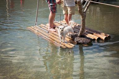 Keywords: raft water human wood raft dog nature on the water drive