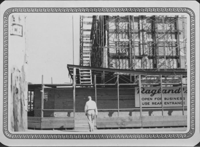 Keywords: steel steel industry steelindustry steel construction steelconstruction construction industry constructionindustry construction equipment constructionequipment buildings blackandwhite monochrome photo border black and white Photograph of Ragland's, a store in Kingsville, Texas, under construction during a remodeling. The construction was done by Arthur Brothers Incorporated using materials provided by John Dollinger Jr., Inc. A man can be seen walking in to a walkway that surrounds the building. To the right is a sign that says "Ragland's, Open for business, use rear entrance." Scaffolding is on all sides of the building. Photograph of Ragland's, a store in Kingsville, Texas, under construction during a remodeling. The construction was done by Arthur Brothers Incorporated using materials provided by John Dollinger Jr., Inc. A man can be seen walking in to a walkway that surrounds the building. To the right is a sign that says "Ragland's, Open for business, use rear entrance." Scaffolding is on all sides of the building. |