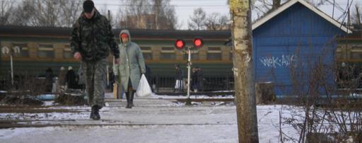 Keywords: Rail Road cross (Kushelevka).jpg Станция «Кушелевка» Пешеходный егули уемый пе еход че ез ж/д пути вид от Полюст овского п оспекта own 2008 user AndreyA Level crossings in Russia Kushelevka railway station