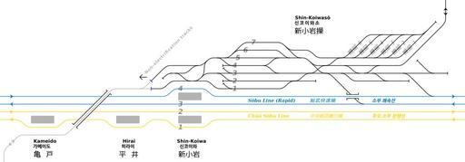 | Keywords: Rail Tracks map around JR-F Shinkoiwaso Station.svg JR Freight Shinkoiwasō station in Katsushika Tokyo Japan Railway track blue Sōbu Line Rapid JR East yellow Chūō-Sōbu Line JR East gray Etchūjima Branch Line Non-electrification system Station n track No Reference material Michitaka Tsuru Yoshihiro Meguro Introducing the major railway stations in Japan Chapter 10 - Starting from Tokyo Station eastwards No 1 RAILWAY JOURNAL CO LTD RAILWAY JOURNAL Tetsudō Journal Japanese magazine Vol 43-8 No 514 2009-8 page 81 京都葛飾区にある日 貨物鉄道 新小岩操駅周辺鉄道配線略図<br /> 参 文献: 鶴 目黒義浩 日 縦断各駅 車 第10章 京から へ (1) 鉄道ジャーナル社 鉄道ジャーナル 第43巻8号( 巻第514号) 2009年8 号 81頁 凡例は駅配線図テンプレートを参照 Plan de voies autour de gare de Shin-Koiwasō JR Freight Katsushika Tōkyō Japon Tawashi2006 created from icons in Category Rail tracks map template 2010-11-23 Tawashi2006 with http //kiritachinoboru tripod com/pdv2svg_en html pdv2svg Tawashi2006 Rail track diagrams of JR Freight train stations Rail track diagrams of JR East train stations Shin-Koiwa Station Kameido Station Etchūjima Line |
