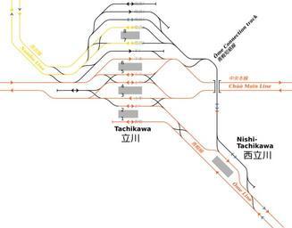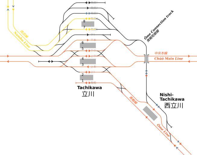| Keywords: Rail Tracks map JR-E around Tachikawa and Nishi-Tachikawa Station.svg JR-East Tachikawa and Nishi-Tachikawa Station in Tachikawa Tokyo Japan <br />Reference material <br /> RAILWAY JOURNAL CO LTD RAILWAY JOURNAL ˜ ™TetsudÅ Journal ™ ™ Japanese Vol 34-3 No 401 2000-3 page 77 <br /> Koji INOUE Haisen-ryakuzu de hirogaru Tetsu no Sekai Japanese ISBN 978-4-7980-2200-0 SHUWA SYSTEM CO LTD 2009 page 139 æ ±äº¬éƒ½ç«‹å· å¸‚ã«ã‚ã‚‹JRæ ±æ—¥æ ¬ ç«‹å· é§…ãƒ»è¥¿ç«‹å· é§…å‘¨è¾ºã®é…線略図<br /> å‚è ƒæ–‡çŒ®ï¼š éˆ´æ ¨æ–‡å½¦ã Œé‰„é“å„ç·šã®å®Ÿæ…‹ã¨å•題をç¾å °ã«è¦‹ã‚‹ï¼ˆ2) ï¼ å—æ¦ç·šãƒ»é ’梅線・五日市線(2)ã ã 鉄é“ジャーナル社ã 㠎鉄é“ジャーナルã ã 第34å·»3å·ï¼ˆé šå·»ç¬¬401å·ï¼‰ 2000å¹´3æ ˆ ã 77é ã ‚ 井上å å¸ã ã Žé…線略図ã§åºƒãŒã‚‹é‰„ã®ä¸–界 ï¼ è·¯ç·šã‚’èªã¿è§£ã ä½ ã‚‹æ ¬ã ISBN 978-4-7980-2200-0ã ç§ å’Œã‚·ã‚¹ãƒ†ãƒ ã 2009ã 139é 凡例ã¯é§…é…線図テンプレートをå‚ç…§ Plan de voies Created with Text Editor Tawashi2006 created from icons in Category Rail_tracks_map_template 2010-01-23 Tawashi2006 with http //kiritachinoboru tripod com/pdv2svg_en html pdv2svg validSVG translation possible Rail track diagrams of JR East train stations Tachikawa Station |