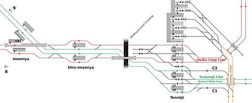 | Keywords: Rail Tracks map JR-W between Imamiya and Tennoji Station.svg Imamiya Station and Tennōji Station JR West Osaka Japan <br /> Railway track Line name colored line red Osaka Loop L orange Hanwa L green Yamatoji L Kansai Main L Connection tracks between Hanwa L and Yamatoji L for Express and Limited Express C1 since 1989 C2 since 2008 Station <small>n</small> smaller black platform No 'n' bigger italic gray track No at Tennōji 'Hn' track No of Hanwa L White crosshatch arrival platform sans-serif font bold black station name Directly access Stations up for Tsuruhashi Kyōbashi Ōsaka by Osaka Loop L right for Ōji Nara Kamo by Yamatoji L Through to the Wakayama L down for Ōtori Wakayama by Hanwa L Through to the Kansai Airport L and the Kisei Main L left N Namba by Yamatoji L B for Bentenchō Nishikujō Ōsaka by Osaka Loop L Through to the Tōkaidō Main L Reference material DENKISHA KENKYUKAI THE RAILWAY PICTORIAL Vol 819 special issue - OSAKA KANJŌSEN Osaka Loop Line Page 42 2009-06 KOYUSHA CO LTD Japan Railfan Magazine Tetsudō Fan Japanese Page 36 Vol 37-11 No 439 1997-11 Ryozo KAWASHIMA Zenkoku Tetsudo Jijyo Daikenkyu - Osaka Nambu Wakayama ISBN 978-4-7942-0516-2 Soshisha Page 17 1993 http //www jr-odekake net/eki/premises php id 0620831 WEST JAPAN RAILWAY official homepage ODEKAKE net - Tennōji Station Japanese 大阪市にあるJR西日 今宮駅から天王寺駅までの配線略図 参 文献: 電気車研究会 鉄道ピクトリアル 巻第819号 2009年6 特集 - 大阪環状線 42頁 特集 JR短絡線ミステリー 鉄道ファン 第37巻11号( 巻第439号) 1997年11 号 36頁 交友社 1997年 島令三 JR阪和線 全国鉄道事情大研究 - 大阪南部・和歌山篇 ISBN 978-4-7942-0516-2 草 社 1993 17頁 http //www jr-odekake net/eki/premises php id 0620831 JR西日 公式ホームページ JRおでかけネット - 天王寺駅(大阪 )- 構内図 凡例は駅配線図テンプレートを参照 Plan de voies Created with Text Editor Tawashi2006 created from icons in Category Rail_tracks_map_template 2009-05-24 Tawashi2006 with http //kiritachinoboru tripod com/pdv2svg_en html pdv2svg Tawashi2006 300px ja validSVG translation possible Rail track diagrams of JR West train stations |
