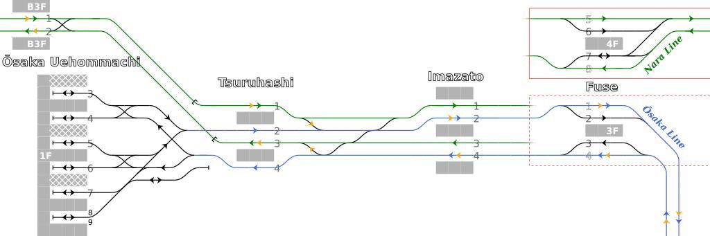 Keywords: Rail Tracks map Kintetsu between Osaka-Uehommachi and Fuse Station1977.svg Kintetsu between Ōsaka Uehommachi Station and Fuse Station Osaka Japan <br /> Railway track Line name or Route colored line with italic font and colored arrow green Nara Line route Through to the Namba Line blue Osaka Line route orange Limited Express Urban Liner all and Ise Shima Liner majority route Station n track No White crosshatch arrival platform White font platform level Outline font station name Directly access Stations right for Ikoma Yamato-Saidaiji and Nara by Nara Line down for Yamato-Yagi Nabari by Ōsaka Line Through to the Toba Kashikojima and the Nagoya left Namba by Namba Line Through to the Amagasaki Sannomiya by Hanshin Namba Line Reference material Keisuke SODA special issue - Search for Quadruple track route Japan Railfan Magazine Tetsudō Fan Japanese Page 38 Vol 41-2 No 478 KOYUSHA CO LTD 2001-2 Kintesu official homepage http //www kintetsu co jp/soukatsu/kounai/uehonmachi html - Ōsaka Uehommachi Station Japanese http //www kintetsu co jp/soukatsu/kounai/tsuruhashi html - Tsuruhashi Station Japanese 大阪市にある近畿日 鉄道 大阪上 町駅から布施駅までの配線略図 参 文献: 祖田 介 特集 短絡線ミステリー4 複 線を探る 鉄道ファン 第41巻2号( 巻第478号) 2001年2 号 38頁 交友社 2001年 近畿日 鉄道公式ホームページ - 構内図 http //www kintetsu co jp/soukatsu/kounai/uehonmachi html 大阪上 町駅 およびhttp //www kintetsu co jp/soukatsu/kounai/tsuruhashi html 鶴橋駅<br /> 凡例は駅配線図テンプレートを参照 Plan de voies Tawashi2006 created from icons in Category Rail_tracks_map_template 2009-06-22 Tawashi2006 with http //kiritachinoboru tripod com/pdv2svg_en html pdv2svg Tawashi2006 Rail track diagrams of Kintetsu Corporation train stations Ōsaka Uehommachi Station |